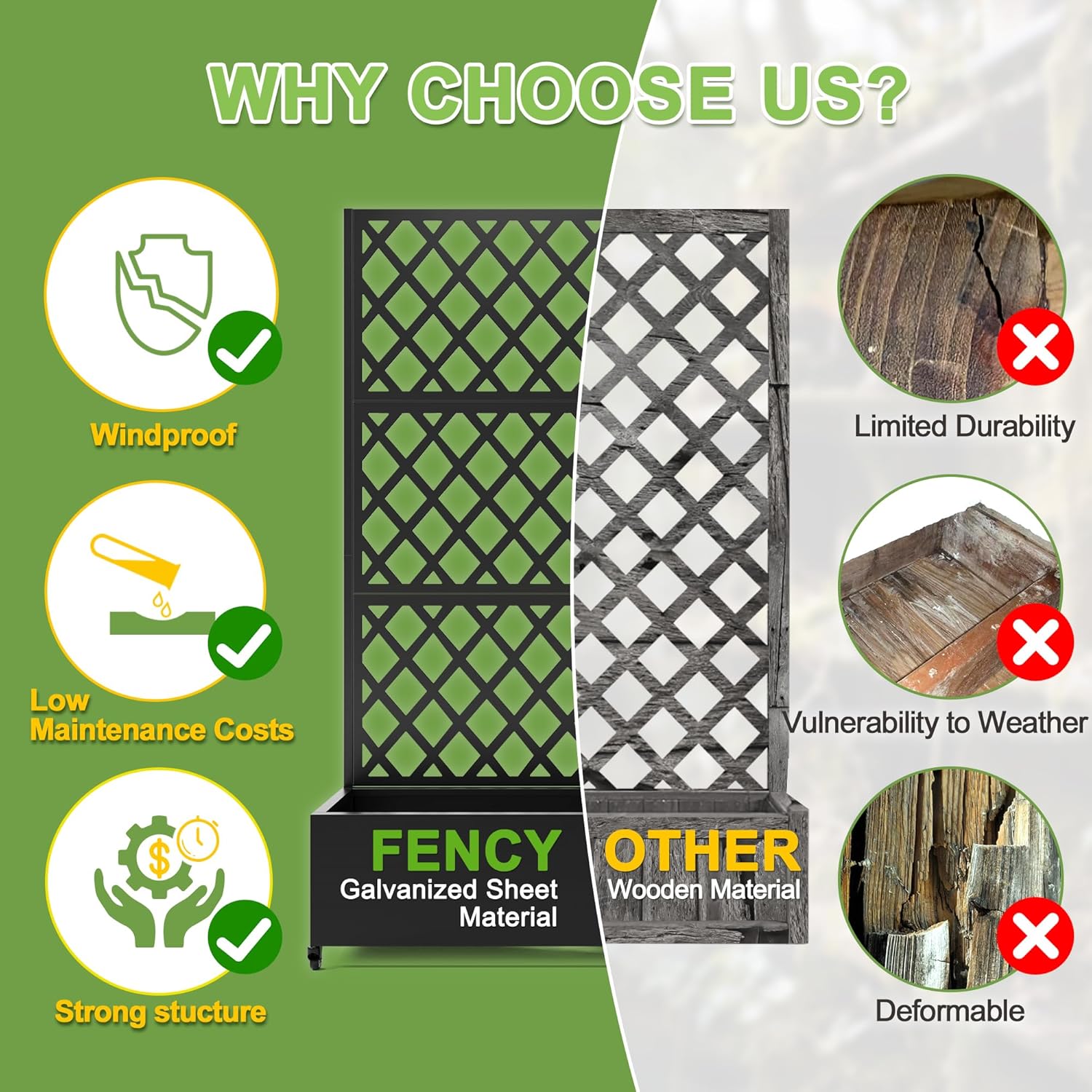 FENCY Metal Planter Box with Diamond Lattice Trellis Planter Box for Climbing Plants/Vines, Galvanized Raised Garden Bed On Wheels, Garden Bed with Trellis(73"x35" Black)
