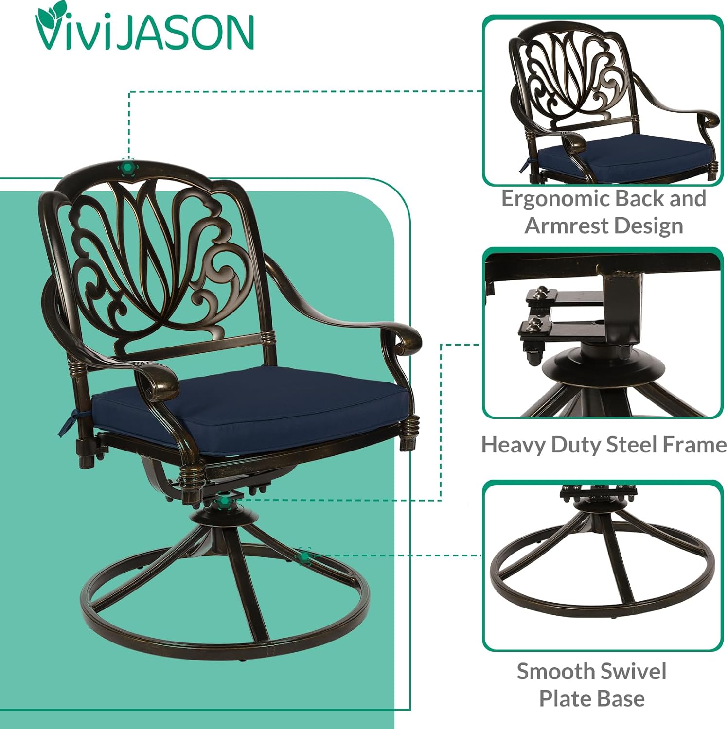VIVIJASON 3-Piece Patio Furniture Dining Set, Outdoor All-Weather Cast Aluminum Bistro Set, Include 2 Swivel Chairs and 31" Round Table w/Umbrella Hole for Balcony, Lawn, Garden (Navy Blue Cushion)