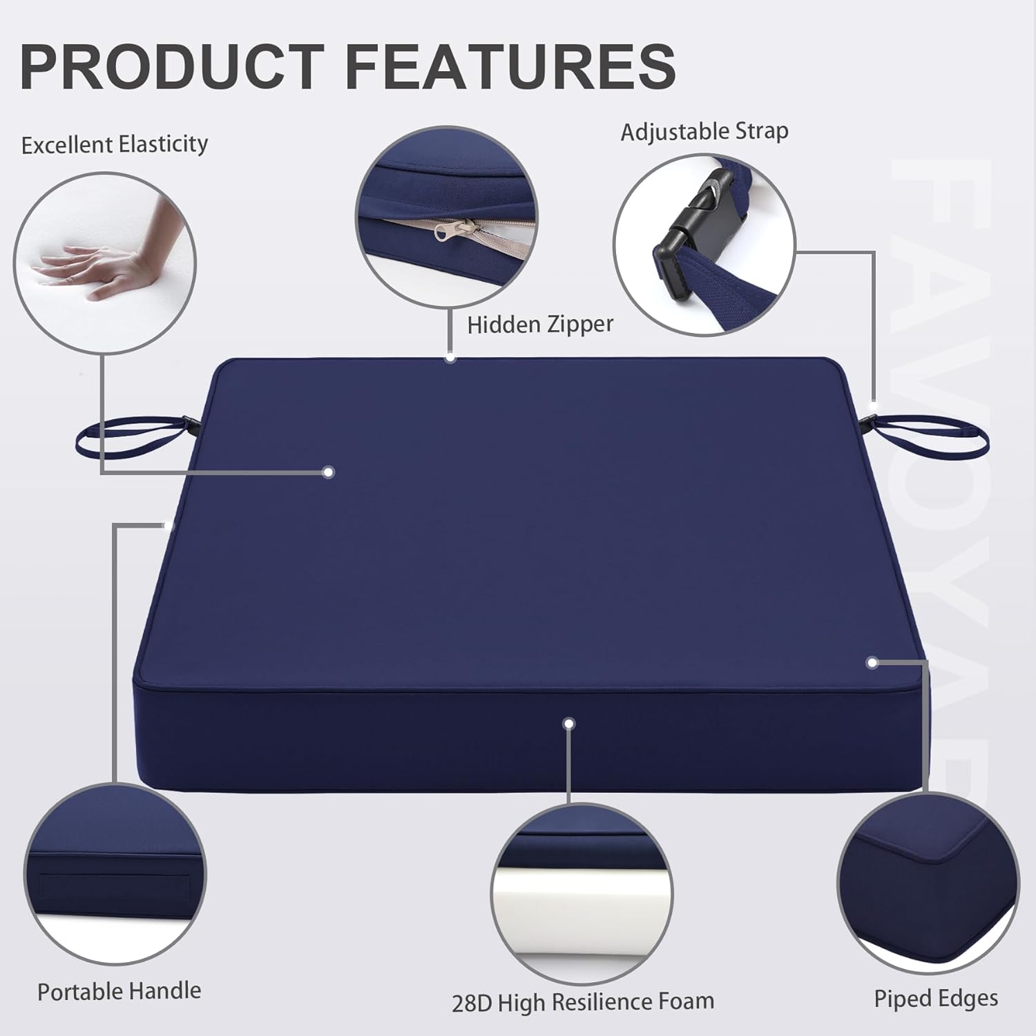 - Portable Outside Chair Cushions with Strap - Favoyard chair cushion is designed with a delicate handle and 2 adjustable straps on the both side, these click close straps keep your cushions exactly where you want them and also ensure that they look great on your furniture. And the handle ensures easy carrying.