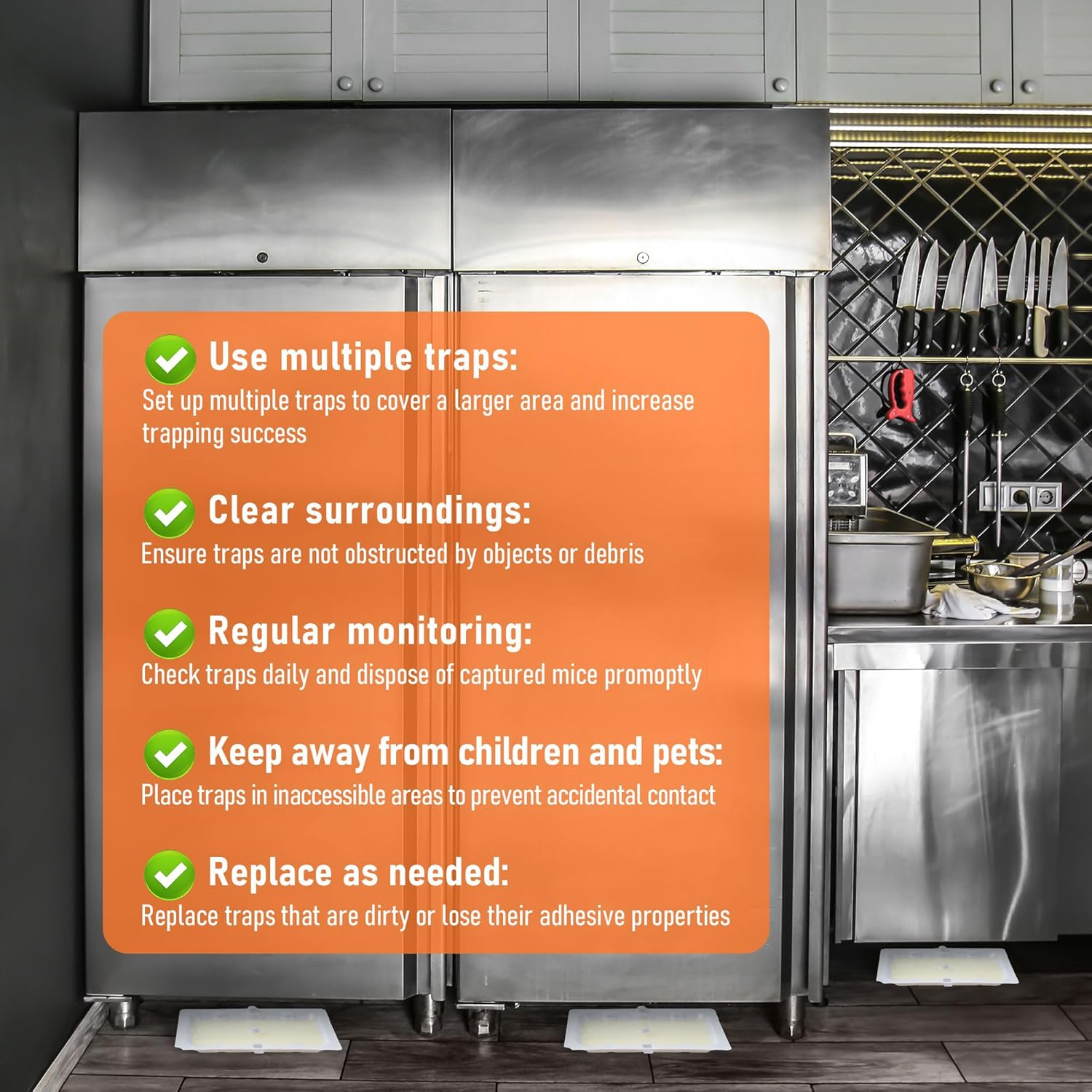 - [Mouse Glue Traps]: Qualirey sticky traps for mice can catch not only mice but also other common pests in your home, and suggested that you position sticky traps along active rodent runways, such as along wall, under large kitchen appliance, in cupboard, and other areas where rodents travel; Be sure to fit the glue trap flush against a wall where rodents will run over and stick to it
