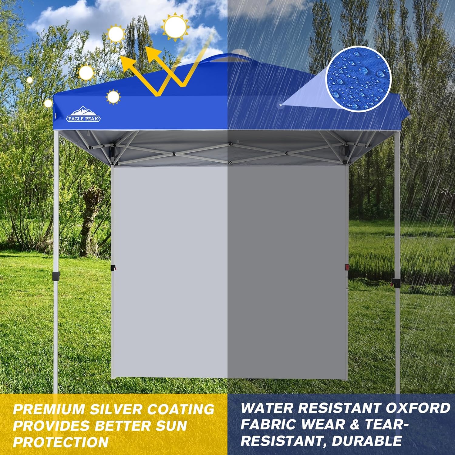 - REMOVABLE SIDEWALL: This outdoor canopy includes one detachable sidewall that secures to the frame with durable, extended Velcro straps. The 150D silver coated oxford canopy top is water resistant, offers UV protection, and meets CPAI-84 fire resistance standards. Enjoy reliable sun shelter and weather protection with heavy duty fabric designed for comfort and safety.