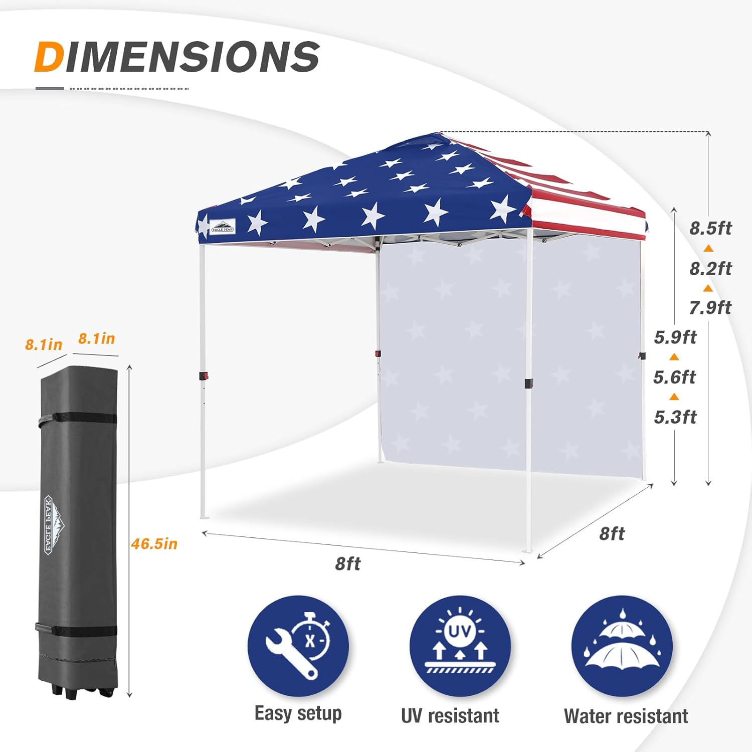 EAGLE PEAK Pop Up Canopy Tent with 1 Sidewall, Easy Setup Event Tent, Outdoor Sun Shade, Wheeled Carry Bag, Stakes and Guy Ropes, Instant Canopy 8x8, American Flag