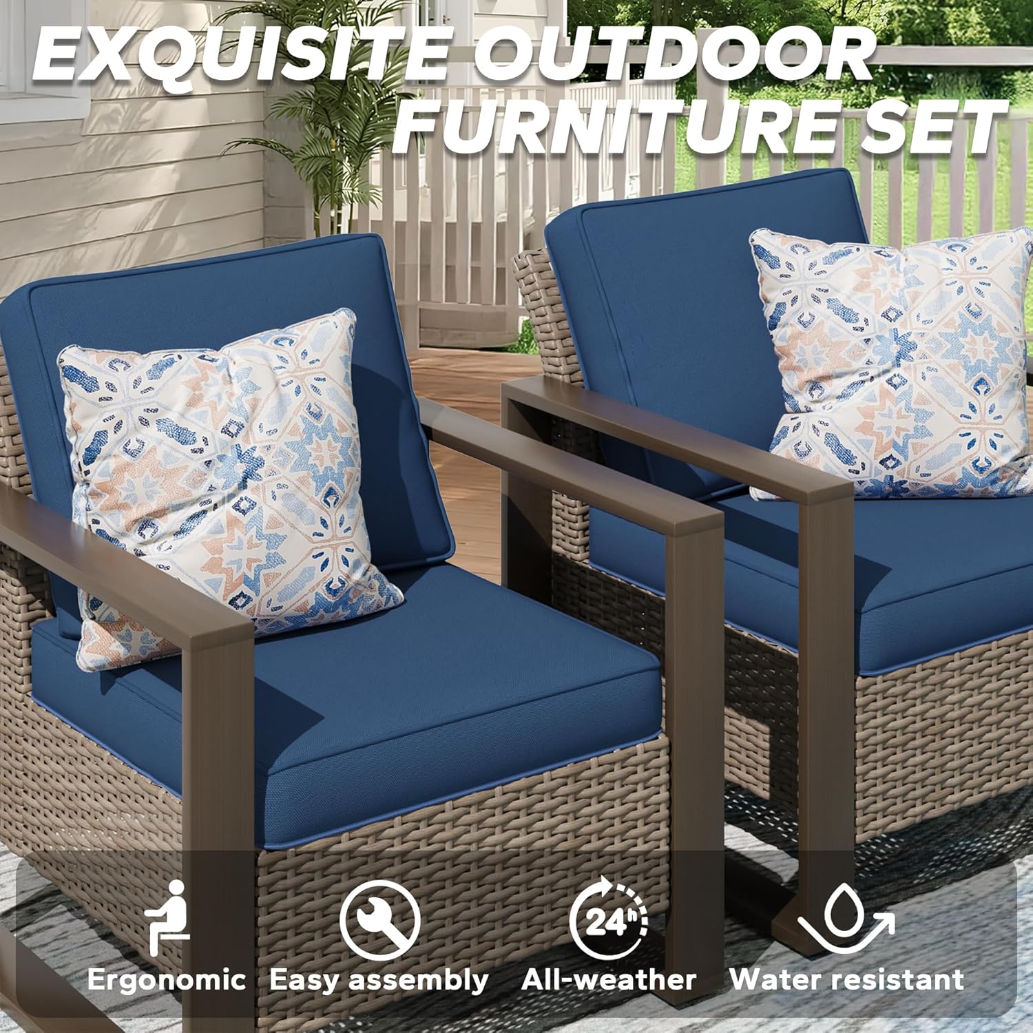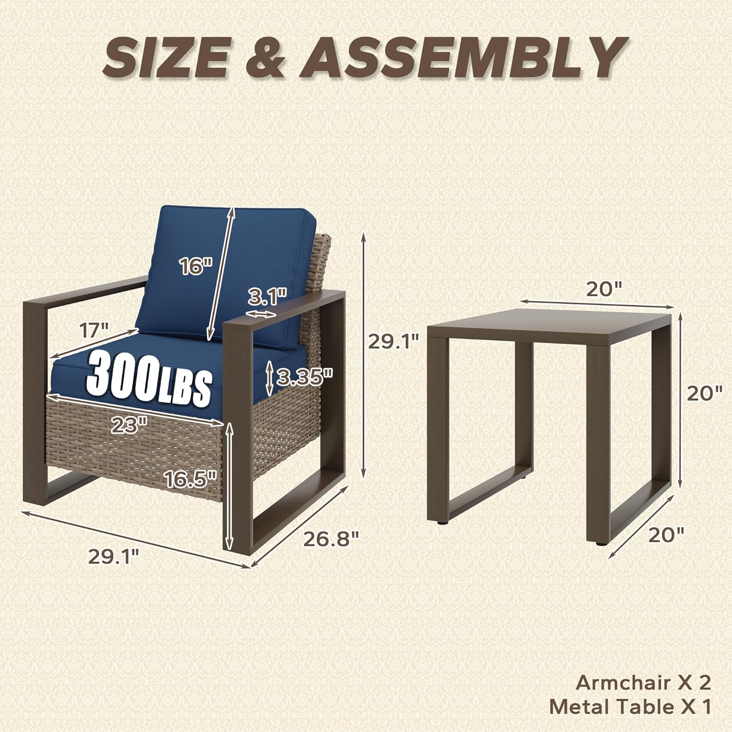 Outdoor Wicker Metal Chairs Set of 2 with Matching Side Table - 3 Pieces Patio Bistro Set with Removable Olefin Fabric Cushions & Rectangular Framed Wood-Looking Metal Armrest, Dark Blue