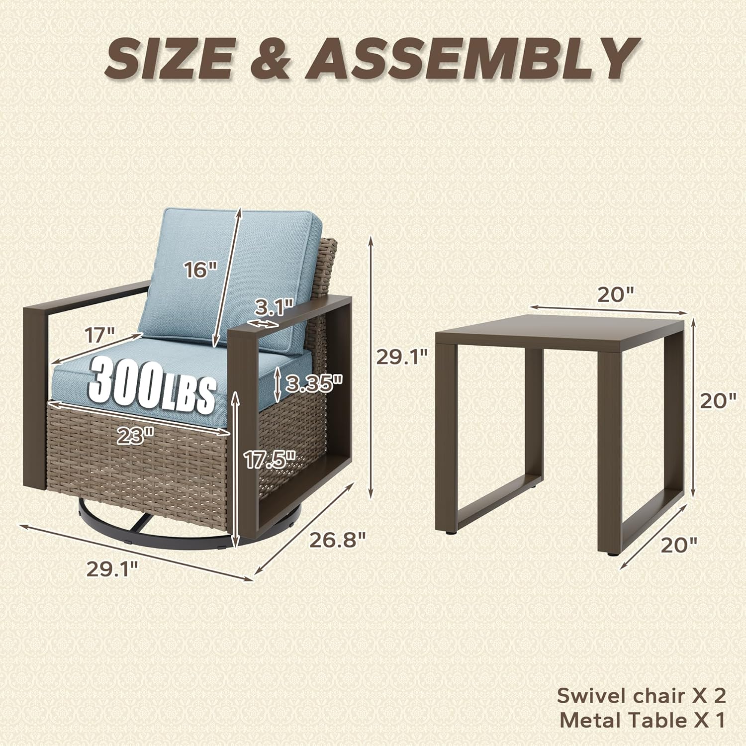- Size : 3 PCS Swivel Chairs Set