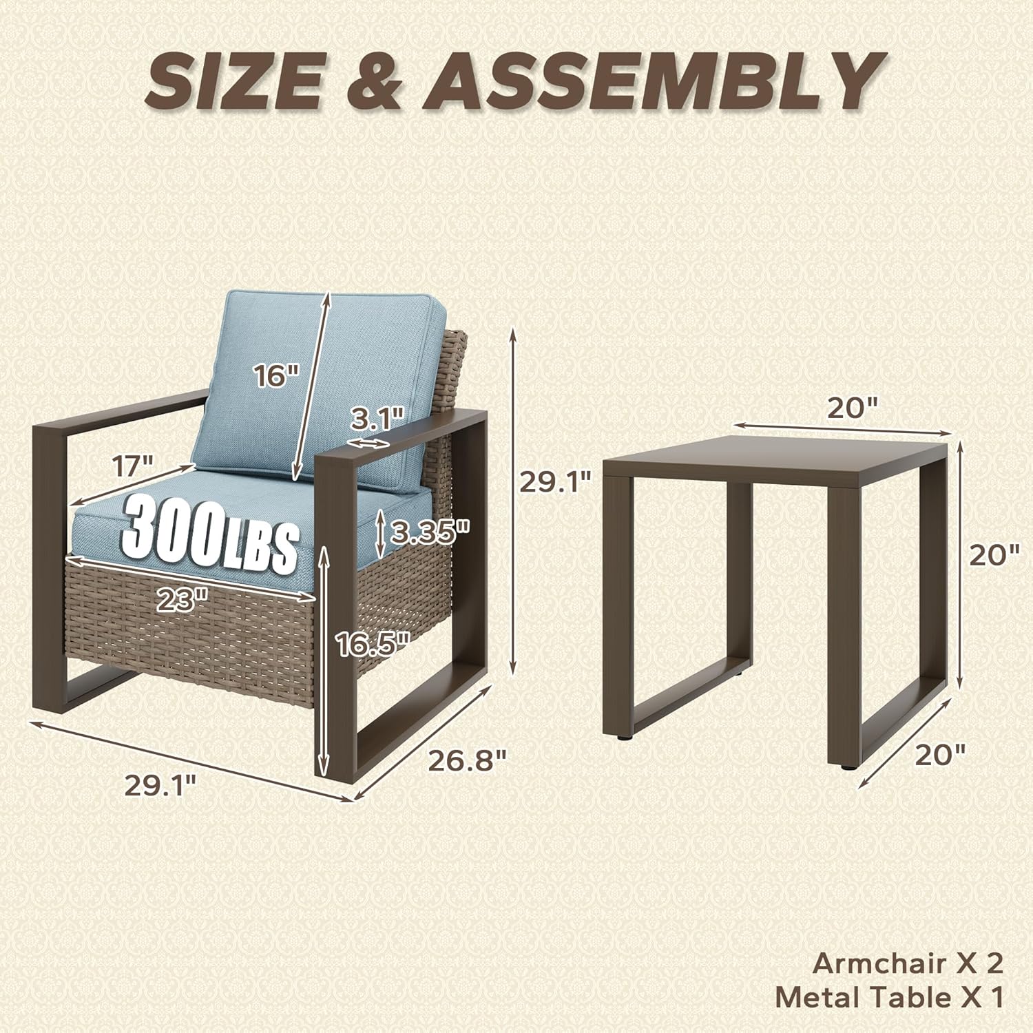 Outdoor Wicker Metal Chairs Set of 2 with Matching Side Table - 3 Pieces Patio Bistro Set with Removable Olefin Fabric Cushions & Rectangular Framed Wood-Looking Metal Armrest, Baby Blue