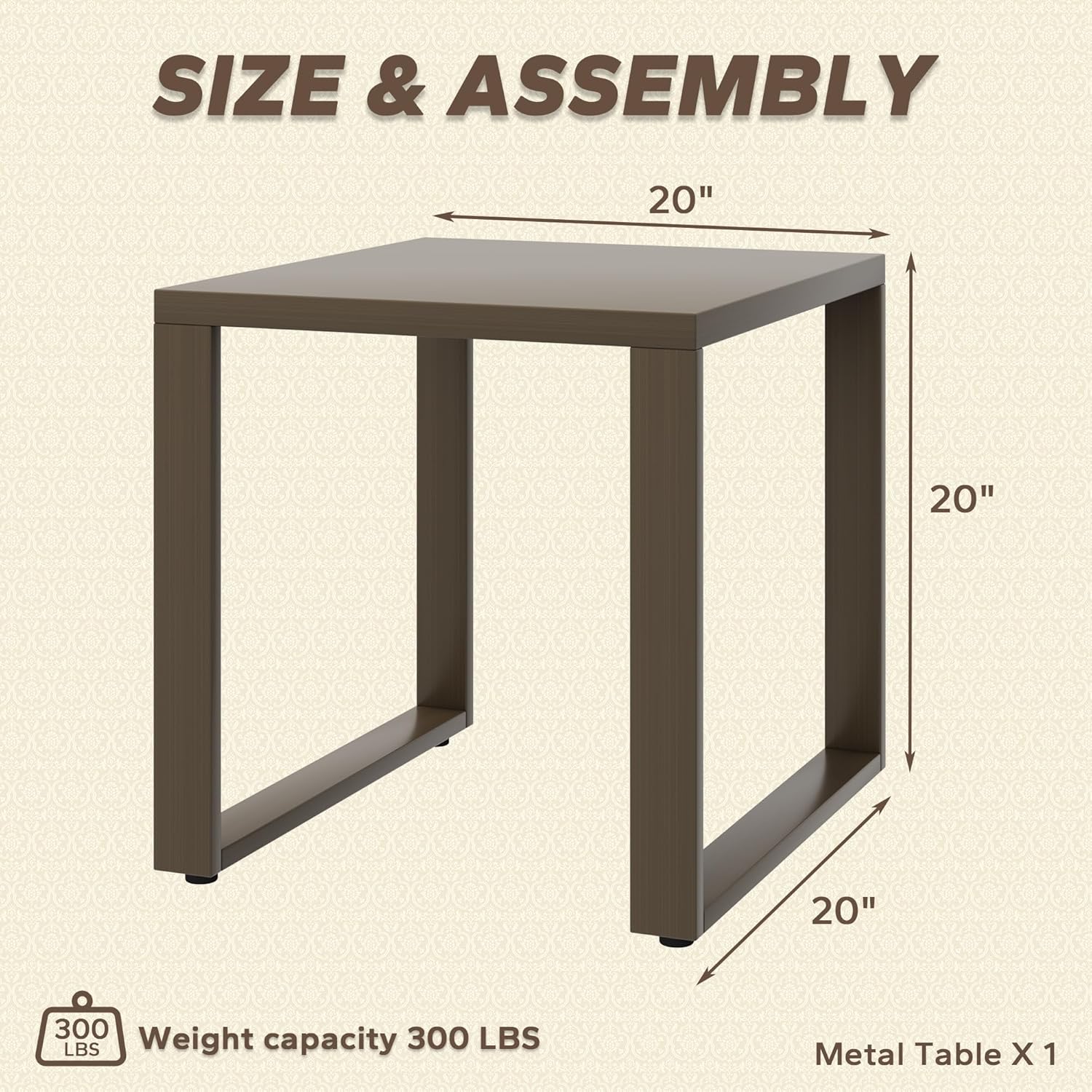 Outdoor Metal Side Table - 20"x 20" Small Square Coffee Table Patio Bistro Set Ideal Match for Patio Furniture, Wood-Looking Brown