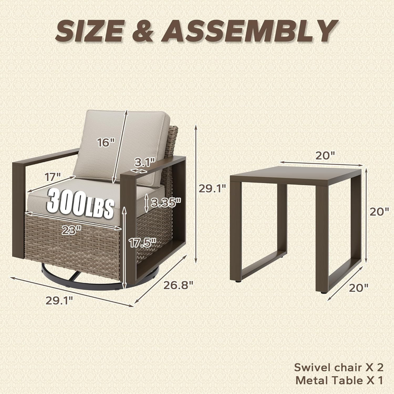 - Size : 3 PCS Swivel Chairs Set