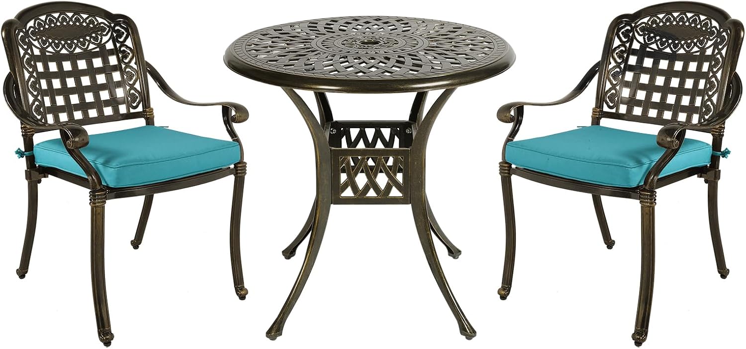 MEETWARM 3 Piece Patio Bistro Set, Outdoor All-Weather Cast Aluminum Dining Furniture Set Includes 2 Chairs with Cushions and a 31” Round Table with Umbrella Hole for Garden Deck, Ocean Blue