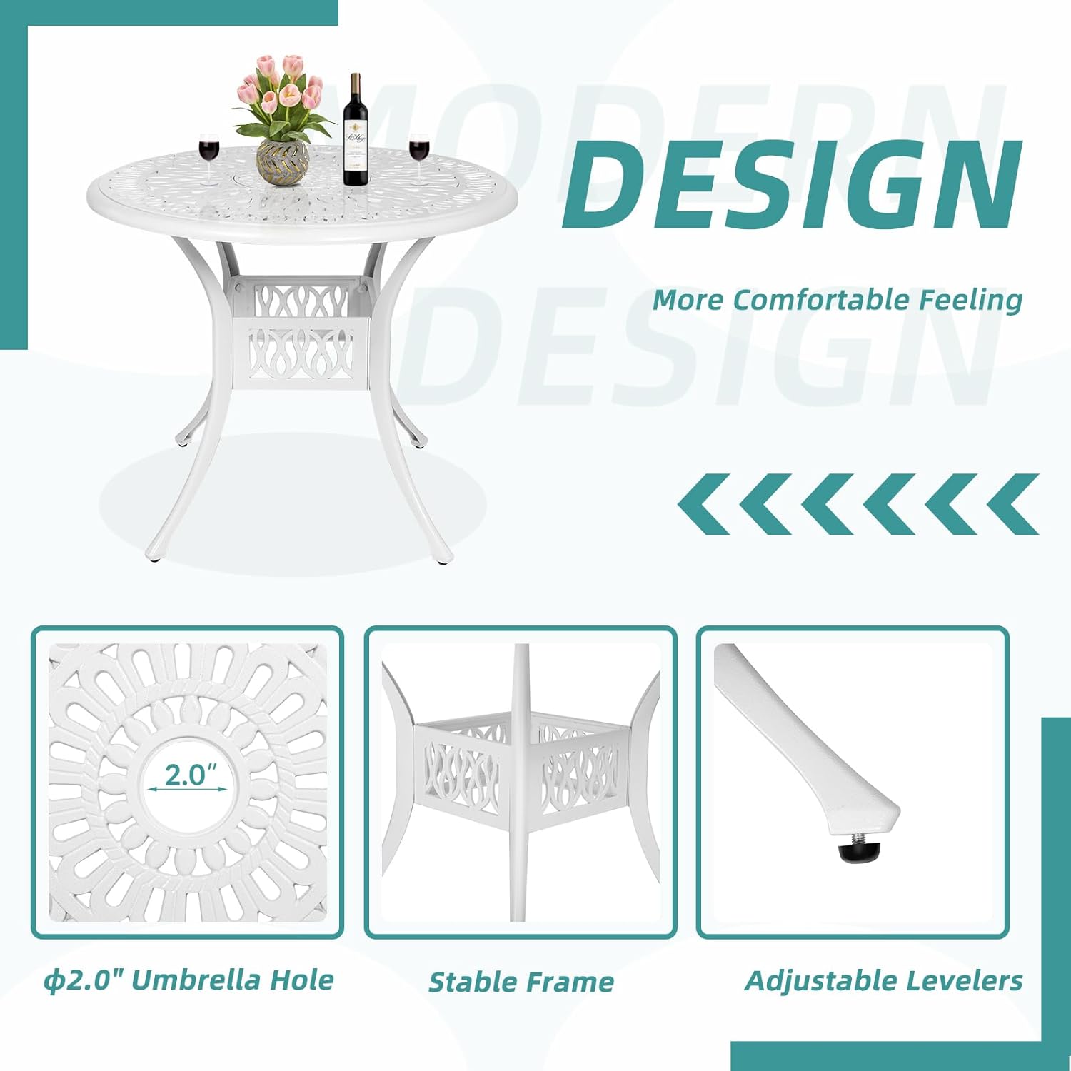 MEETWARM 3 Piece Patio Bistro Set, Outdoor All-Weather Cast Aluminum Dining Furniture Set Includes 2 Chairs and a 35.4” Round Table with Umbrella Hole for Garden Deck, White
