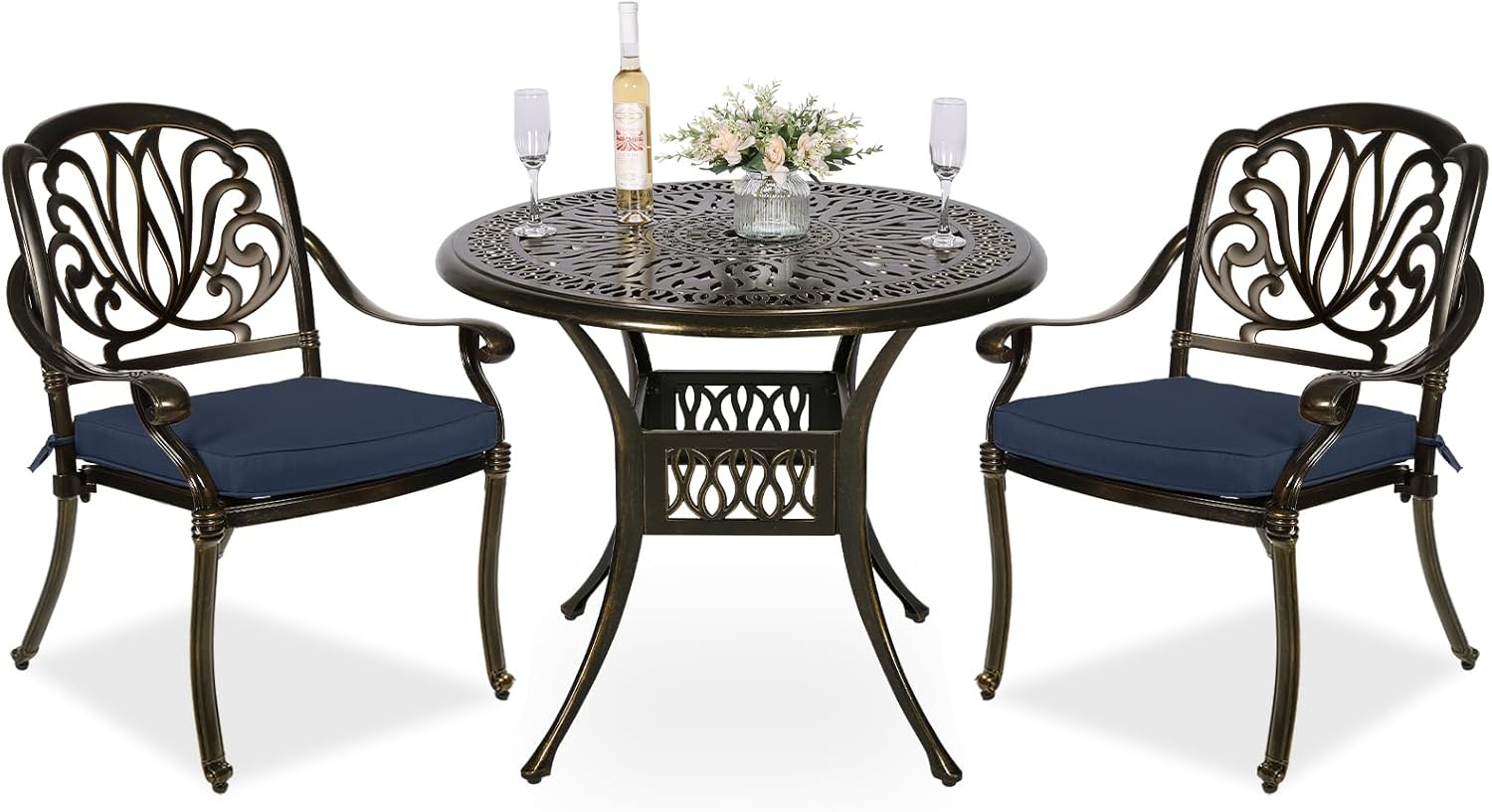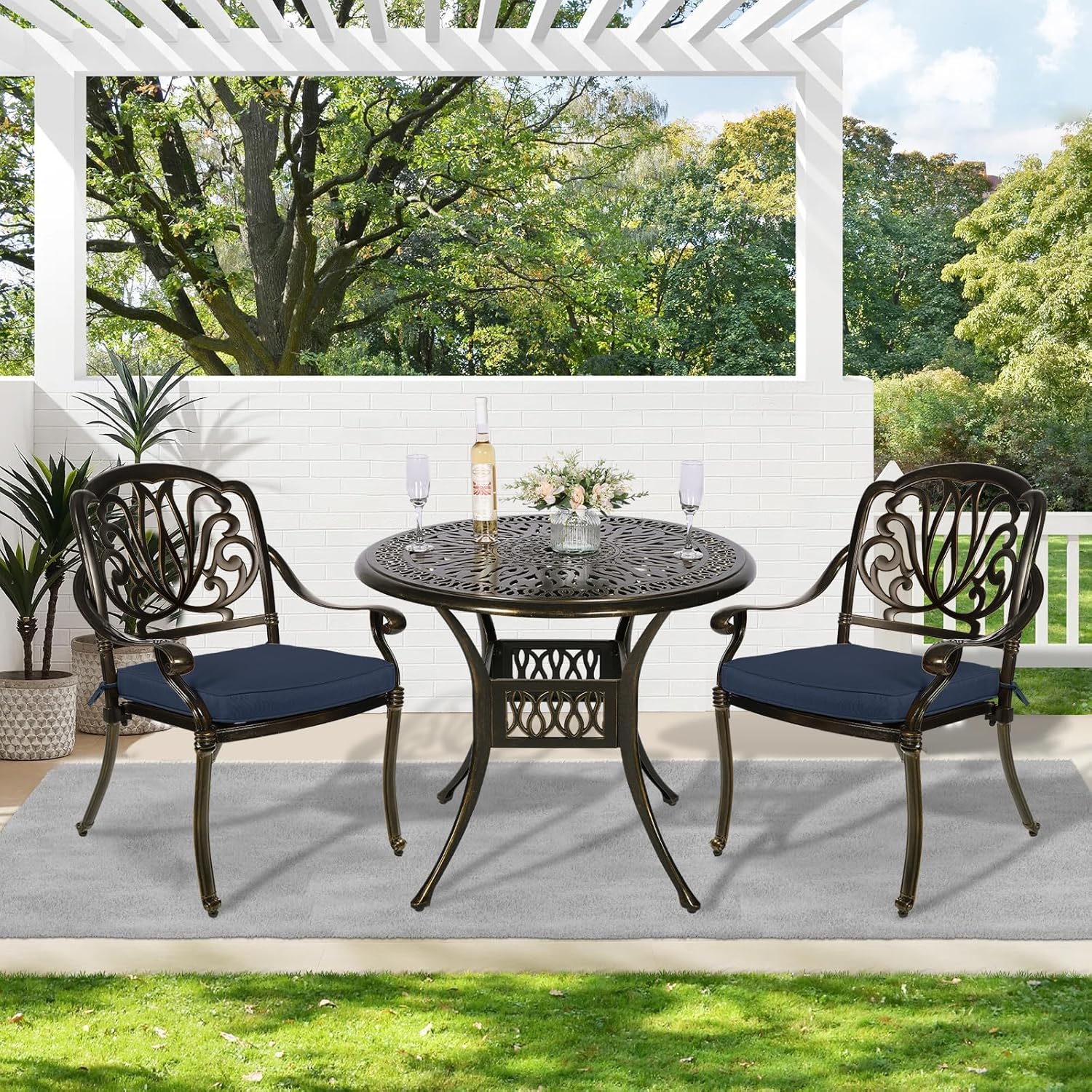 MEETWARM 3 Piece Patio Bistro Set, Outdoor All-Weather Cast Aluminum Dining Furniture Set Includes 2 Cushioned Chairs and a 35.4” Round Table with Umbrella Hole for Garden Deck, Navy Blue