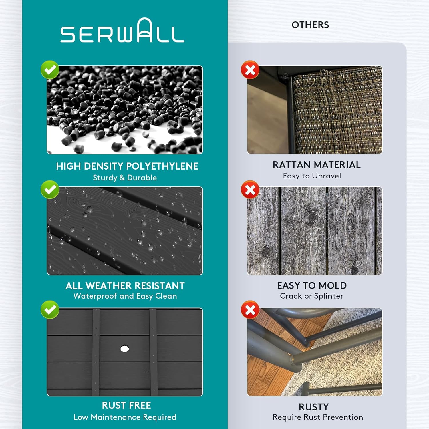 - 【Low Maintenance】HDPE dining table sets required low maintenance. Unlike the Steel dining sets may require rust prevention, SERWALL patio dining table and chairs are easy to clean with just soap and water, requiring minimal effort to keep them looking fresh.