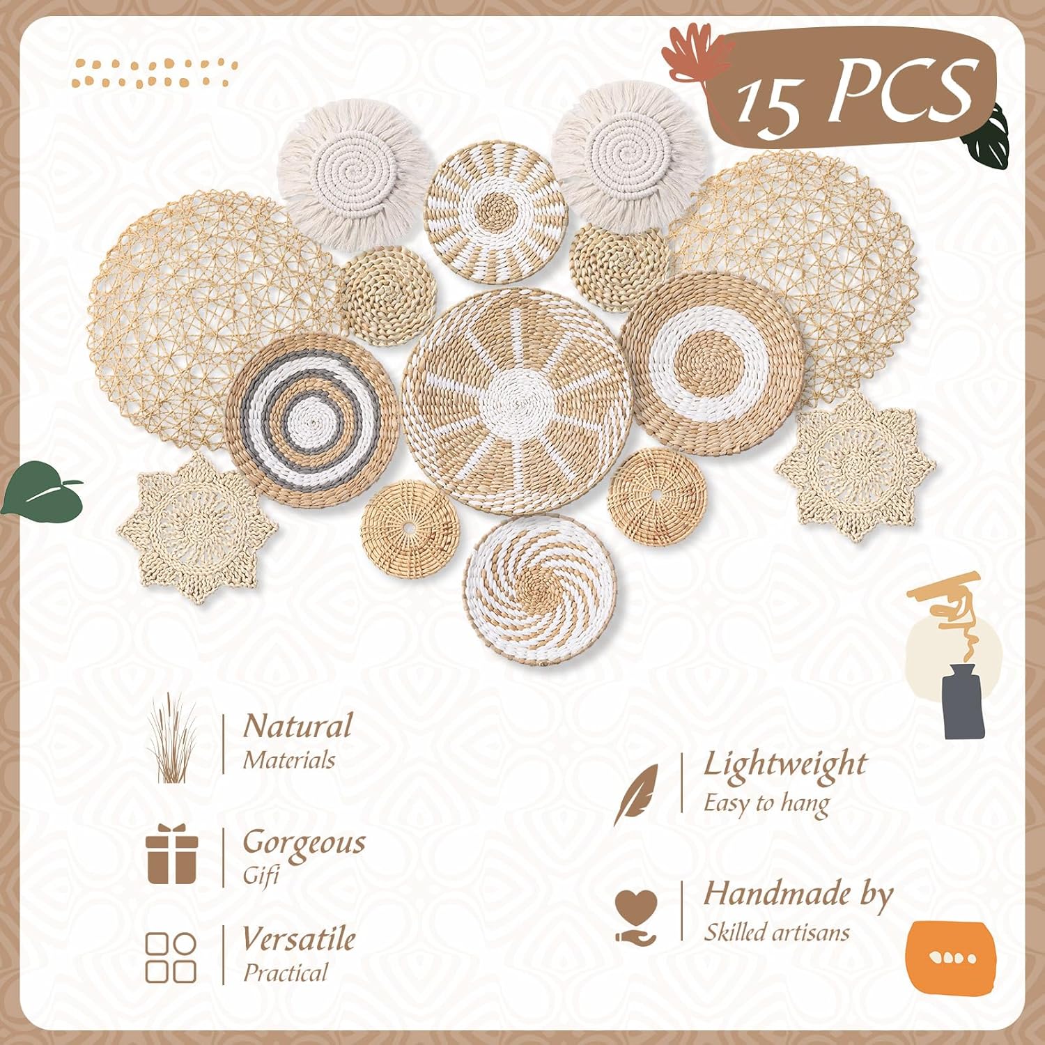 15 Pcs Boho Wall Basket Decor Woven Rattan Seagrass Wall Decor Hanging Rustic Farmhouse Western Art Decoration for Nursery Living Room Bedroom Home Kitchen(Grey White Style)