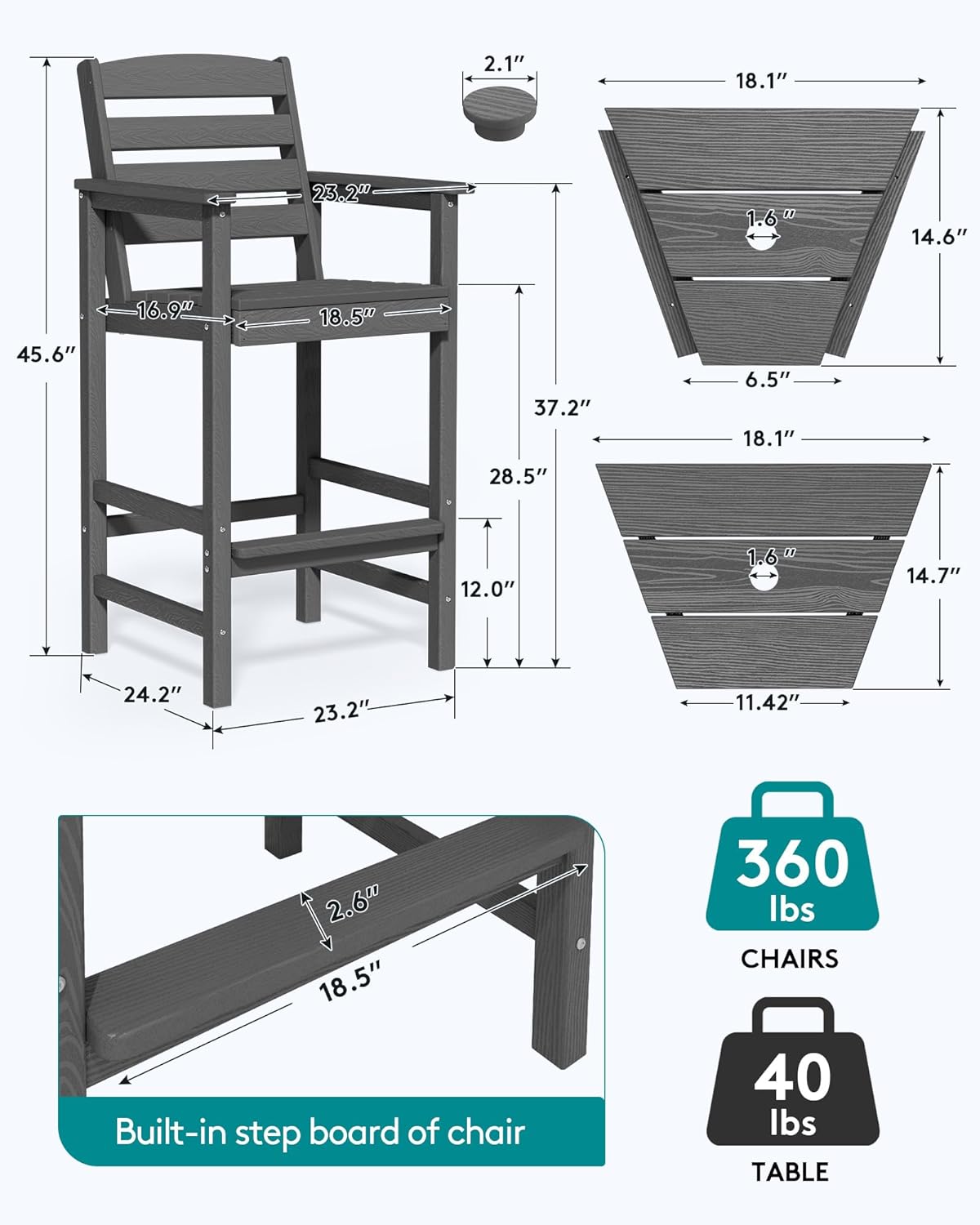 - Bar Height Adirondack Chairs Set: The unique 28.5" seat height design of our Tall Adirondack Chairs set with Connecting Tray(weight capacity: 40 lbs) allows your view is no longer obstructed by the railings. Enjoy the view from your balcony at a comfortable height, providing a perfect vantage point for relaxation.