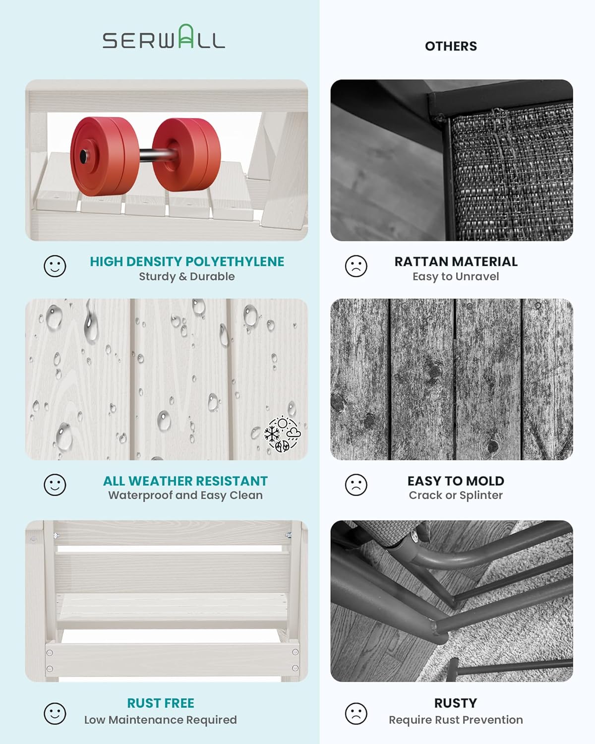 - 【Low Maintenance】HDPE dining table sets required low maintenance. Unlike the Steel dining sets may require rust prevention, SERWALL patio dining table and chairs are easy to clean with just soap and water, requiring minimal effort to keep them looking fresh.