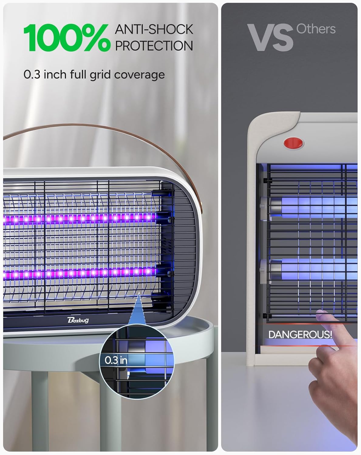 - 360° All-round Protection: There is a dense protective net on the outside of the product to prevent fingers from entering the inside of the device. ABS insulated plastic case to prevent electric shock. The product kills insects physically and emits no odors or smoke. There is a power switch on the right side of the zapper, which can easily cut off the power.