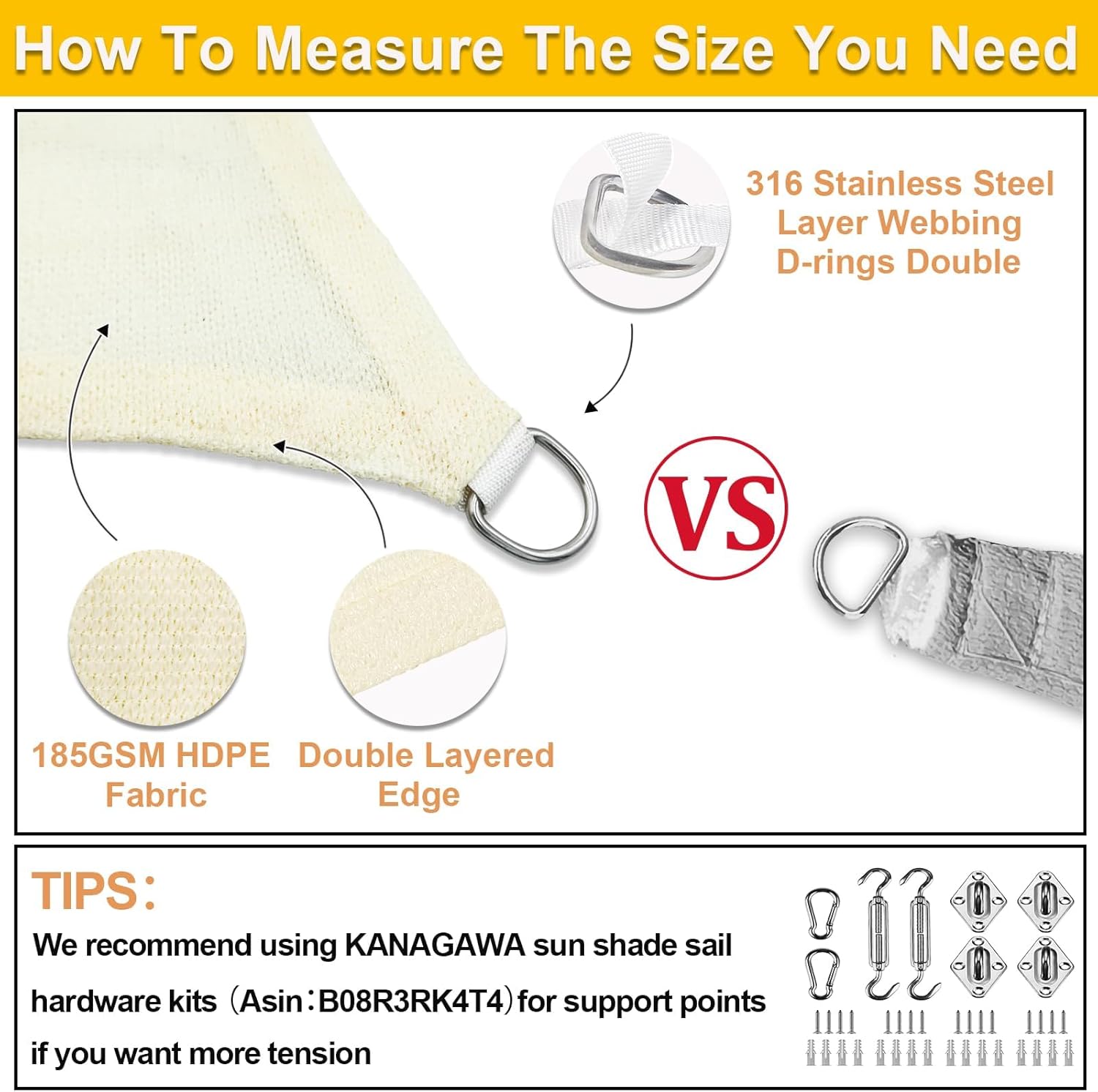 - ★【Ultra-high-quality materials】Made of 100% brand new 185 GSM HDPE (high density polyethylene) material.Our sunshade sail is attached with DOUBLE layer webbing in each side and stainless steel D rings in corners to make the sun sail shades stronger and more durable.