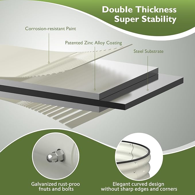 - Oval Designed & Galvanized Material: Raised garden beds outdoor is made of double-layer galvanized metal sheet with anti-rust coating to avoid rusting. The nuts and bolts are also galvanized. Elegant oval design with firm structure and no sharp corners