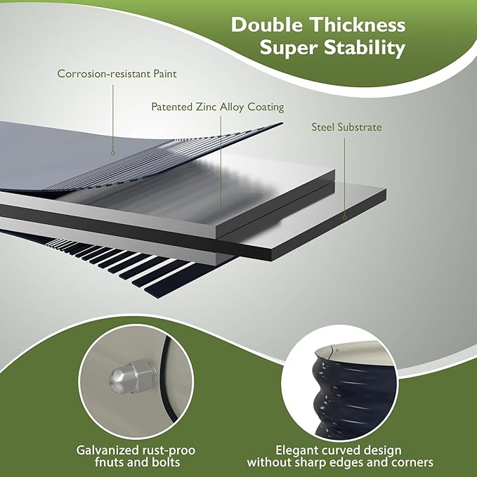 - Upgraded Durability and Structure: The average thickness of this galvanized corrugated steel garden bed reaches 0.8mm, and the thickest part can reach 1.8mm, Multi-screw reinforcement prevents deformation and can be reused for many years