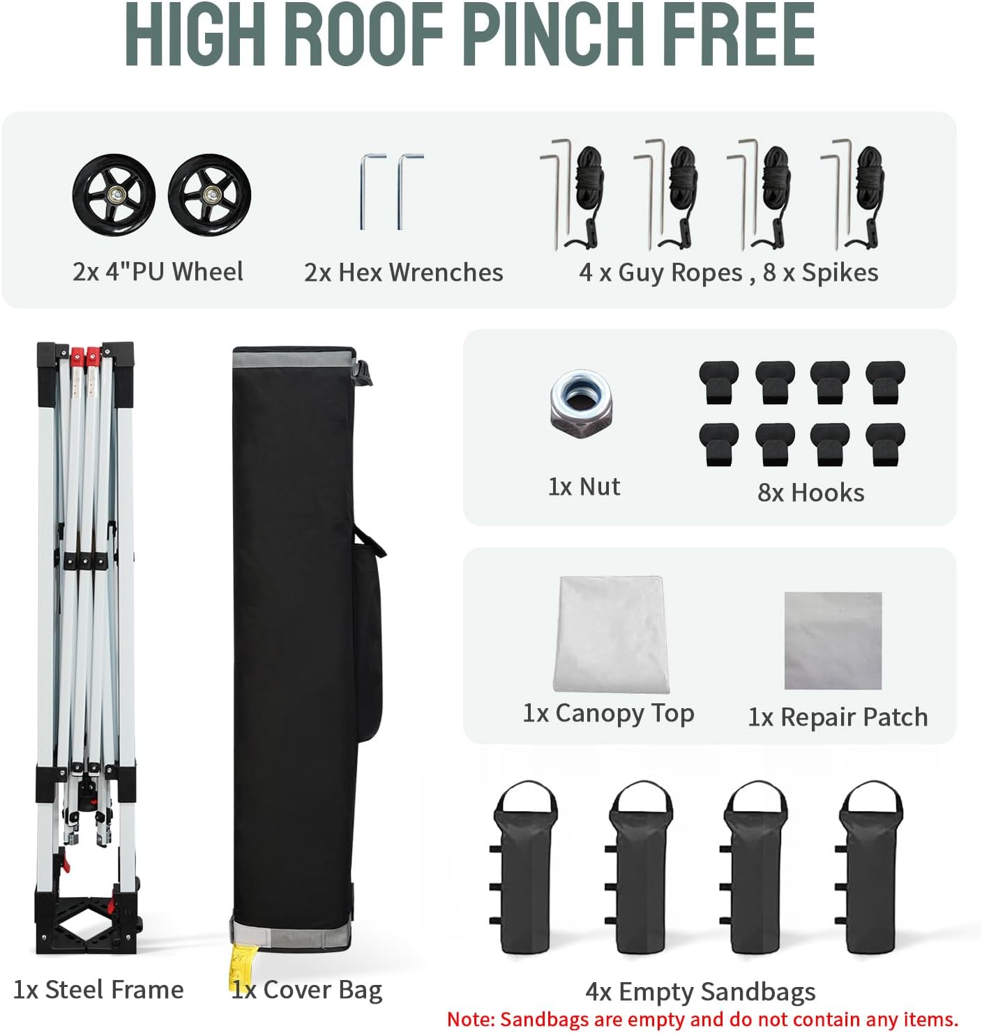 - [EASY TRANSPORT & STORAGE]: Weighing just 48.5 lbs, this canopy is designed for easy transport in your vehicle. The enlarged wheels of the Sto'N Go bag provide enhanced maneuverability, making it simple to take your canopy wherever you need shade.Comprehensive Accessories Included:8 hooks, 2 large 4" wheels, a sturdy steel frame, a cover bag, a canopy top, a repair patch, 2 hex wrenches, a nut, 4 guy ropes, 8 spikes, and 4 empty sandbags.