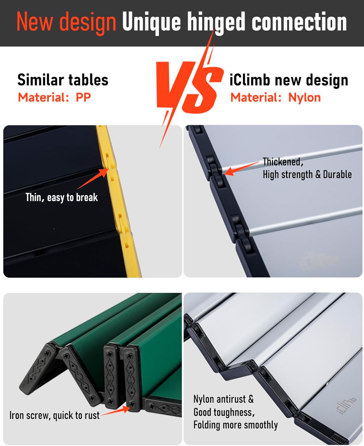 - Lightweight, made of aerospace-grade aluminum alloy, only 5.8 lbs; Max Load 88 lbs; Unlike wooden or nylon-top tables, this table is durable, waterproof, corrosion-resistant, easy to clean; Sturdy joints and anti-slip feet keep the table stable, with legs that won’t fold, bend, or slip on any terrain; Very easy to set up, just open the base frame and attach the tabletop, enjoy your leisure time in seconds, video guide available on this page.