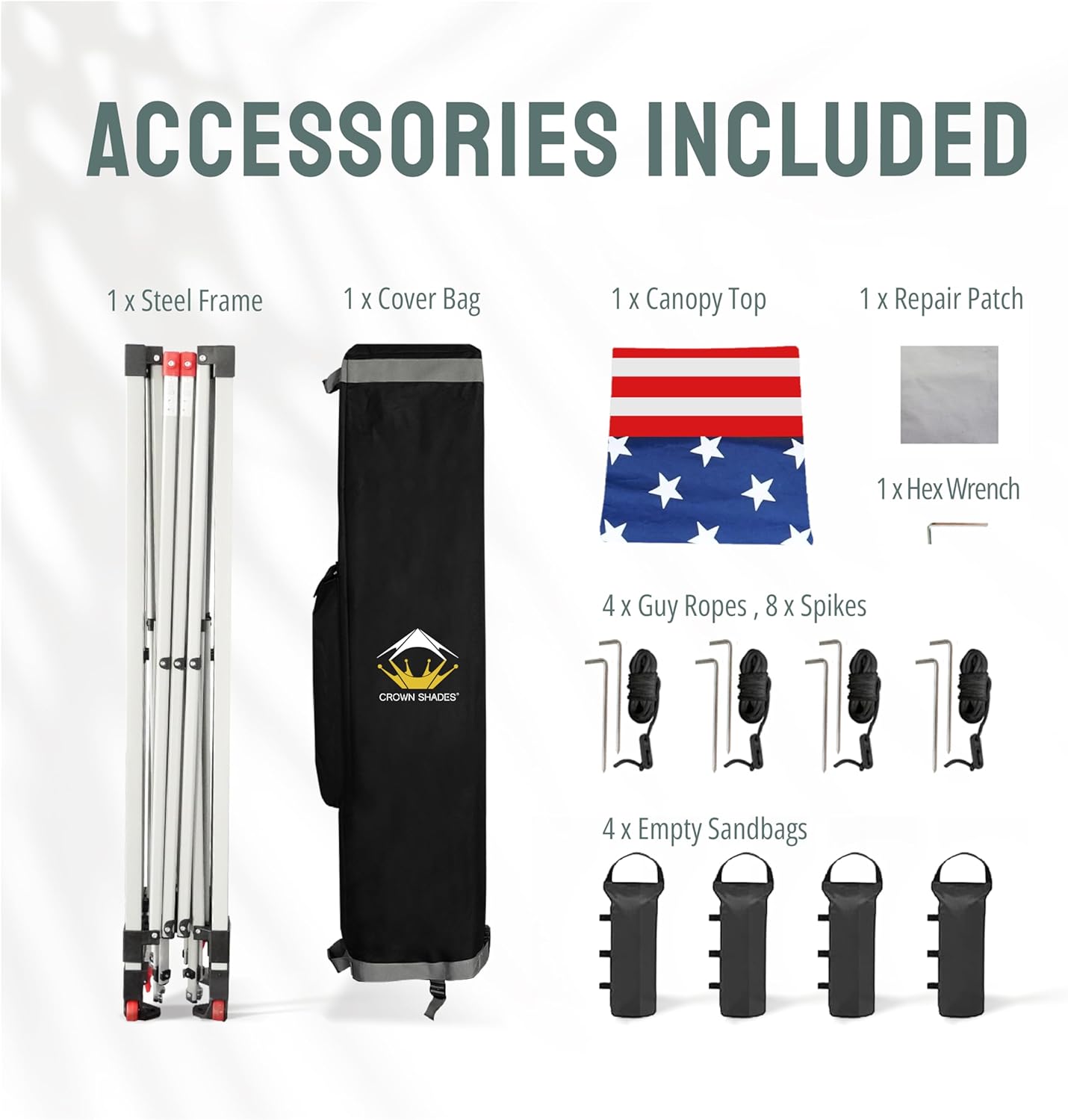 CROWN SHADES 10x10 Pop Up Canopy - Beach Tent with One Push Setup - Easy Outdoor Sun Shade for Events, Parties, Camping - Gazebo with STO-N-Go Cover Bag, Silver Coated Top, American Flag