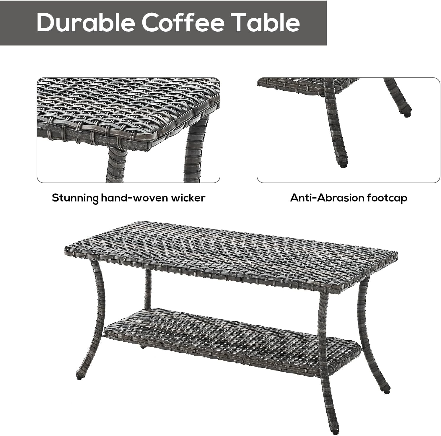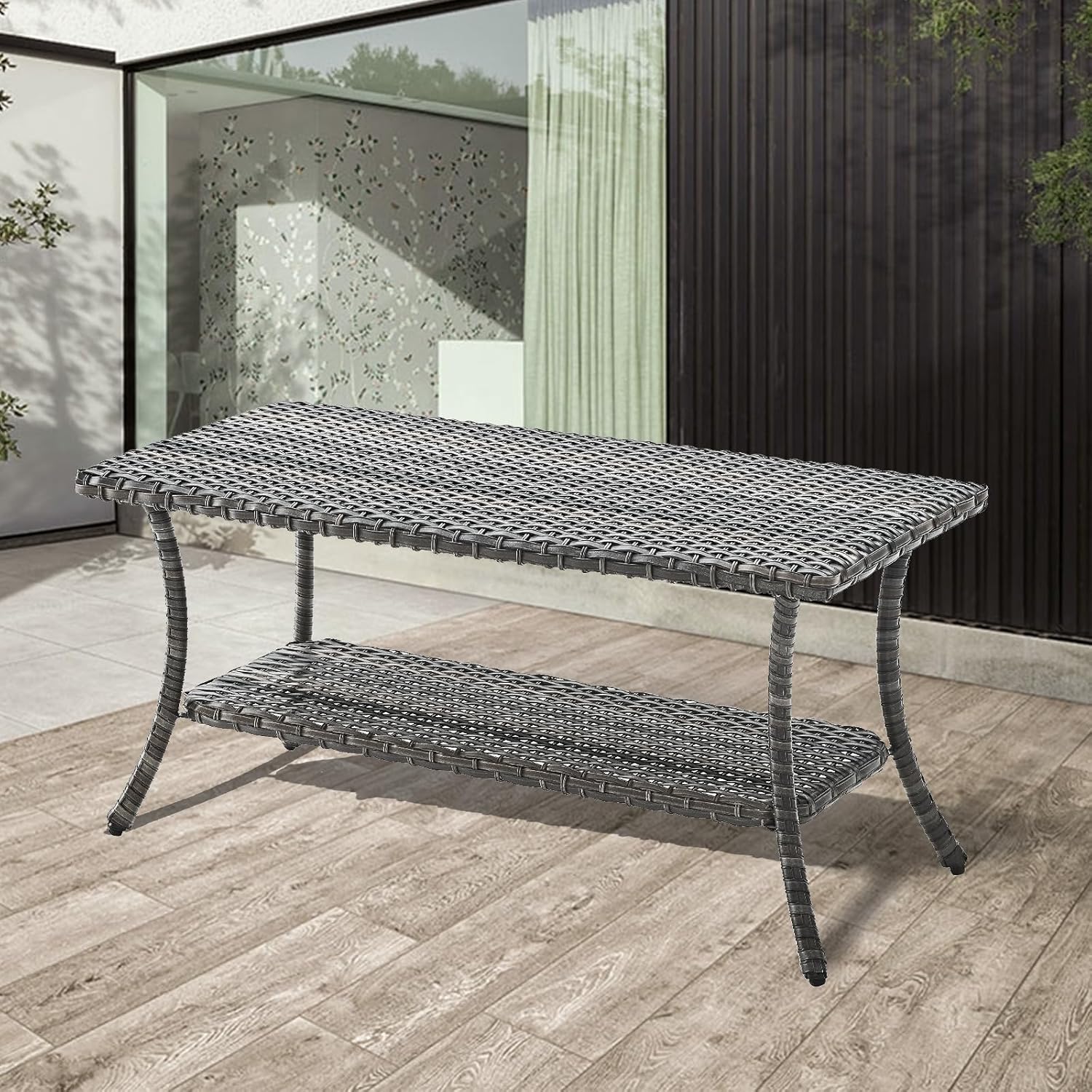 Patio Tables Outdoor Coffee Table - Wicker Rattan Coffee Tables with 2-Tier Storage Shelf Side Table for Porch Deck Balcony Garden Outside Rectangle Mixed Grey
