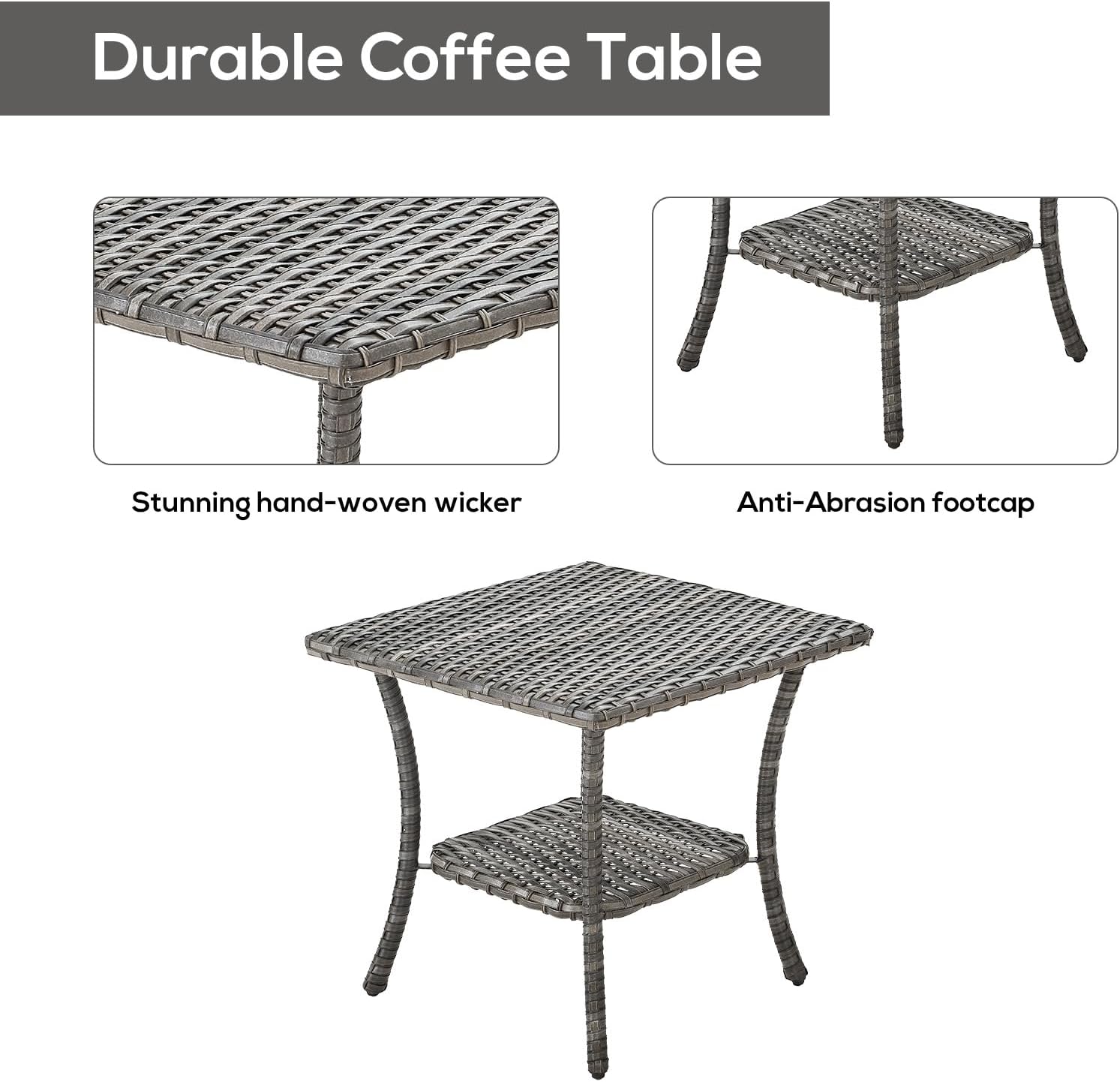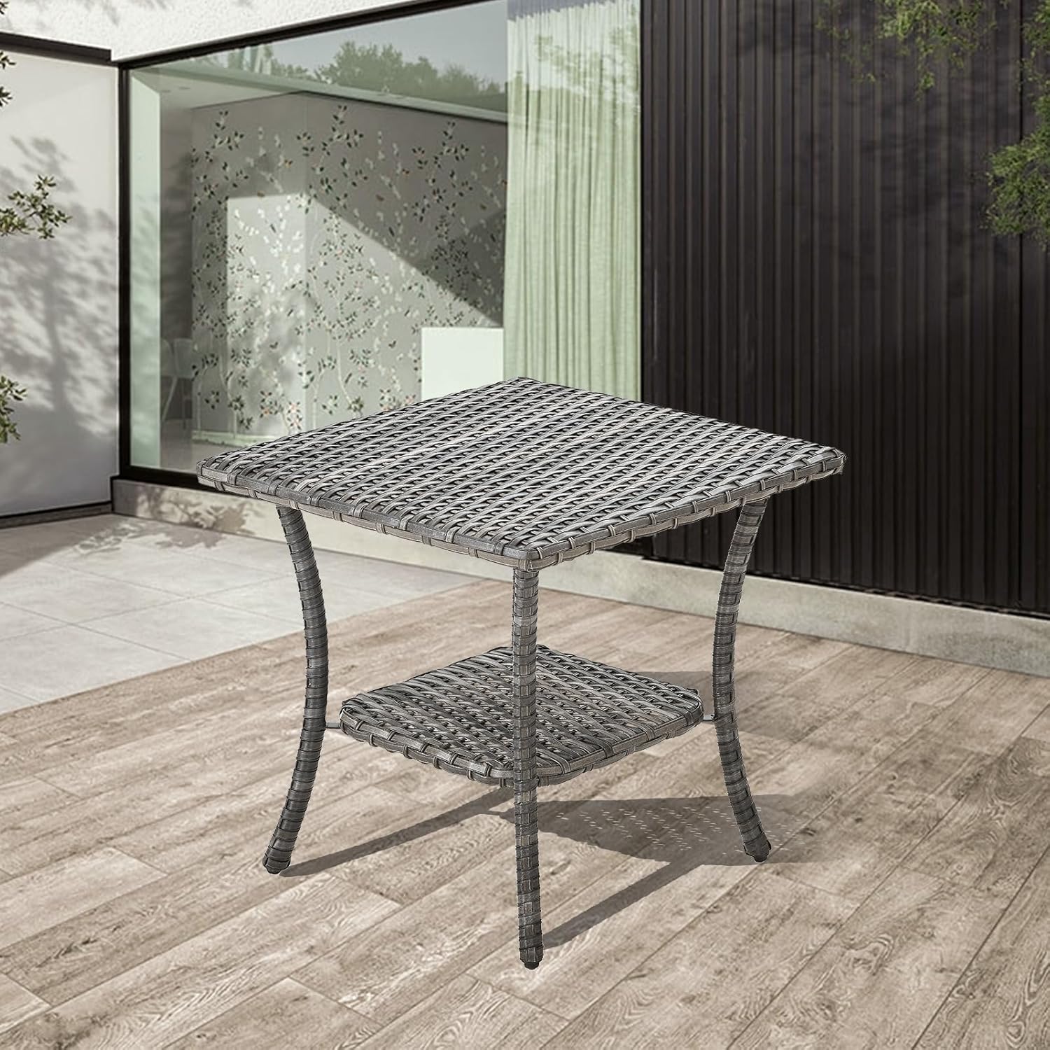 Patio Tables Outdoor Coffee Table - Wicker Rattan Side Tables with 2-Tier Storage Shelf End Table for Porch Deck Balcony Garden Outside Square Mixed Grey