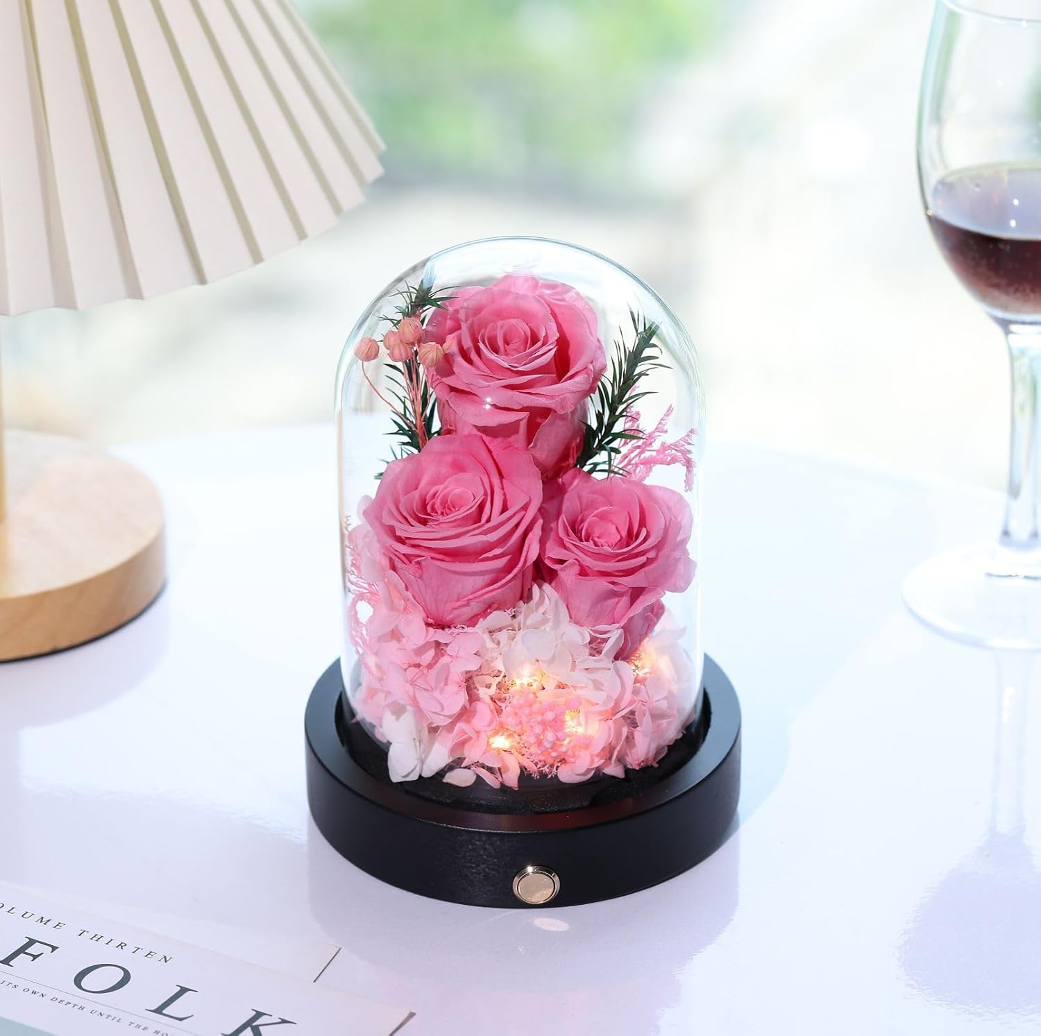- 2. Stunning Variety: Choose from a wide range of colors including red, pink, purple, and yellow. Each rose bouquet comes beautifully presented in a glass dome with a high-quality wooden base, complemented by delicate switches and LED lights. Whether it's a birthday, Valentine's Day, Mother's Day, Thanksgiving, Christmas, anniversary, Party, Graduation, or any special occasion, our eternal flowers make the perfect gift for your girlfriend, mother, wife, daughter, grandmother, best friend, partner or colleague