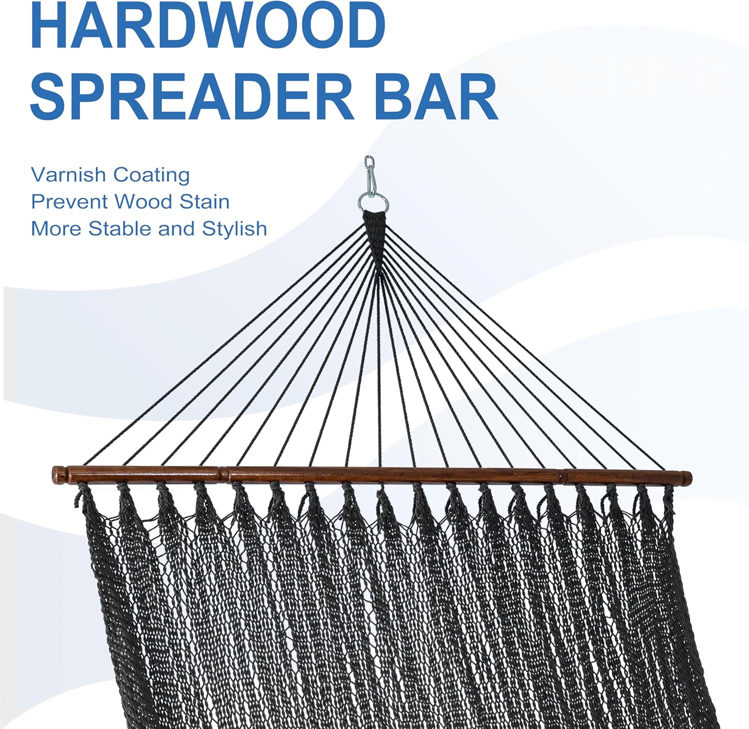 - What’s In The Package: 1 Caribbean rope hammock is included in the package (Hammock stand not included) and two chains; Hammock with stylish vintage hardwood spreader bars creates a safer zone for you, 51 inches durable hardwood spreader bar made of FSC-Certified wood; It's easily hanging between two trees or a hammock stand with an "o" ring at each end