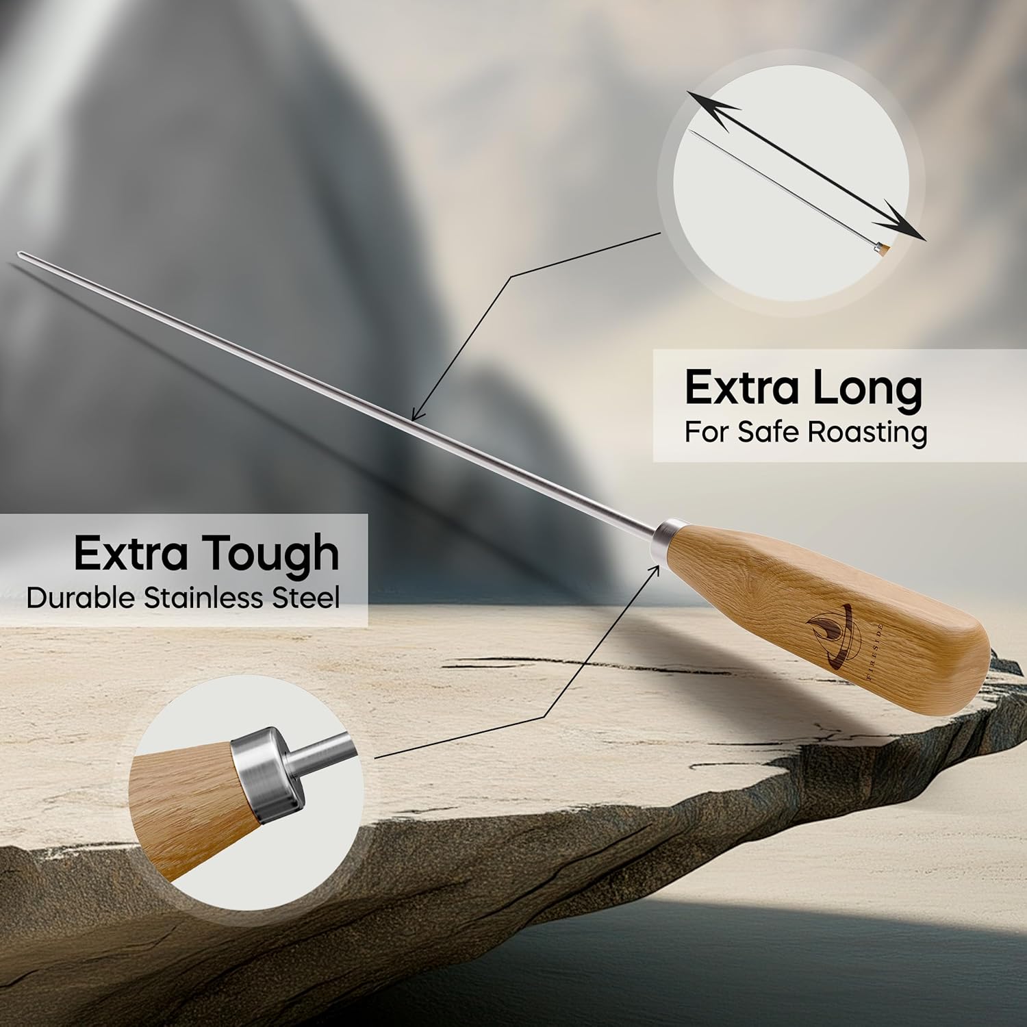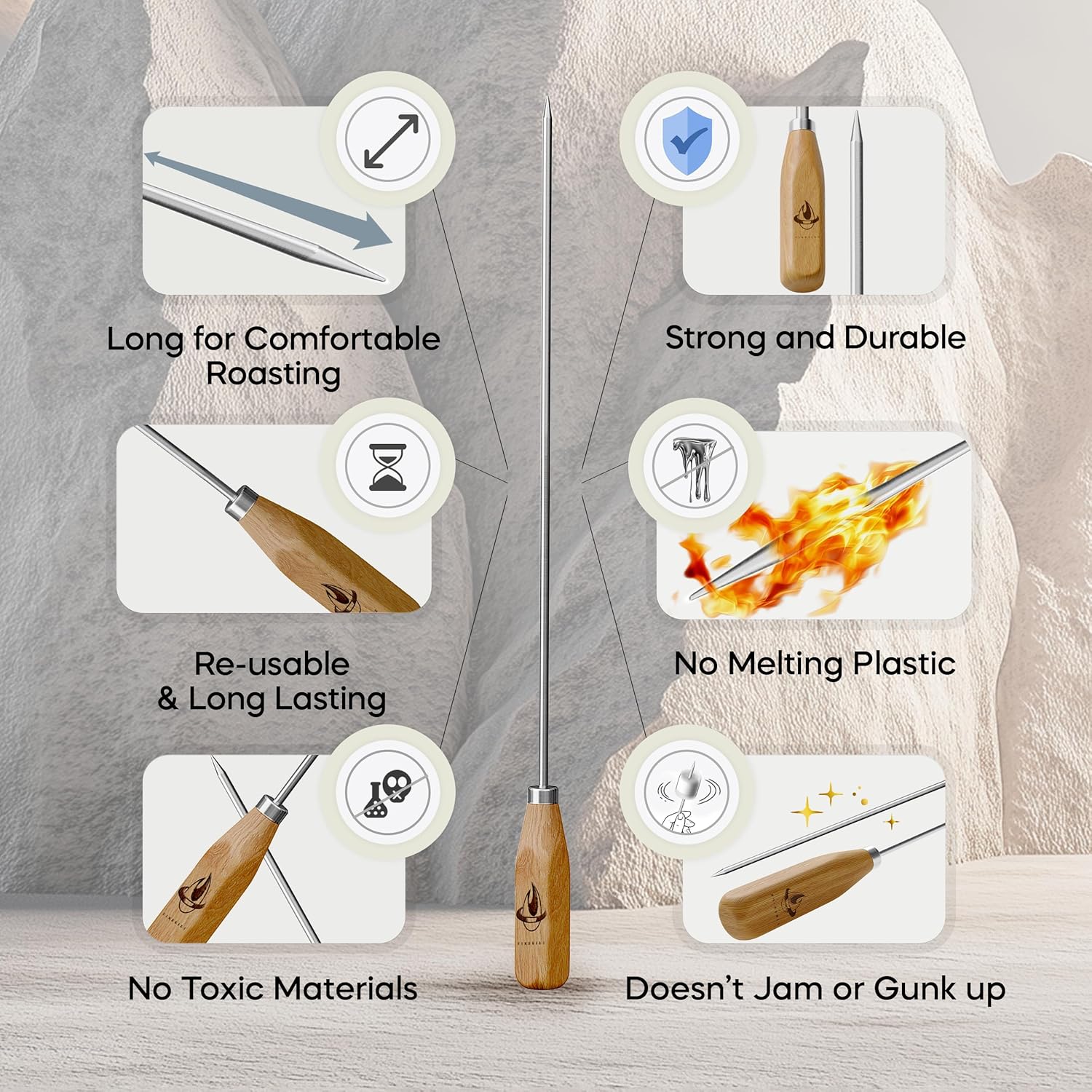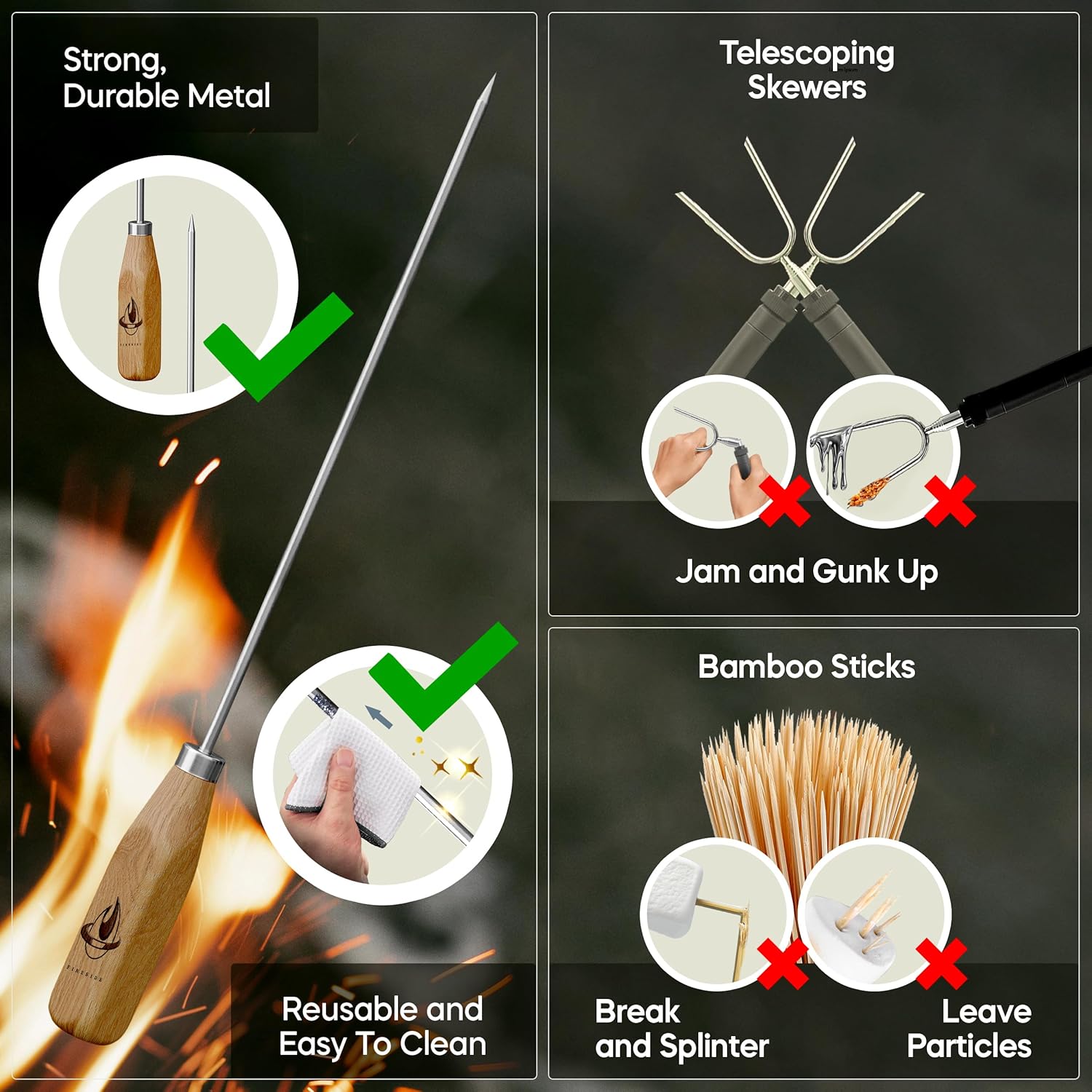 - 🛡️ RUST-PROOF WITH WOODEN HANDLE: Made from stainless steel, these marshmallow skewers are built to resist rust, corrosion, and heat, ensuring safe roasting. The smooth hardwood handle provides a firm grip, protecting against accidental burns or exessive heat on your hands.