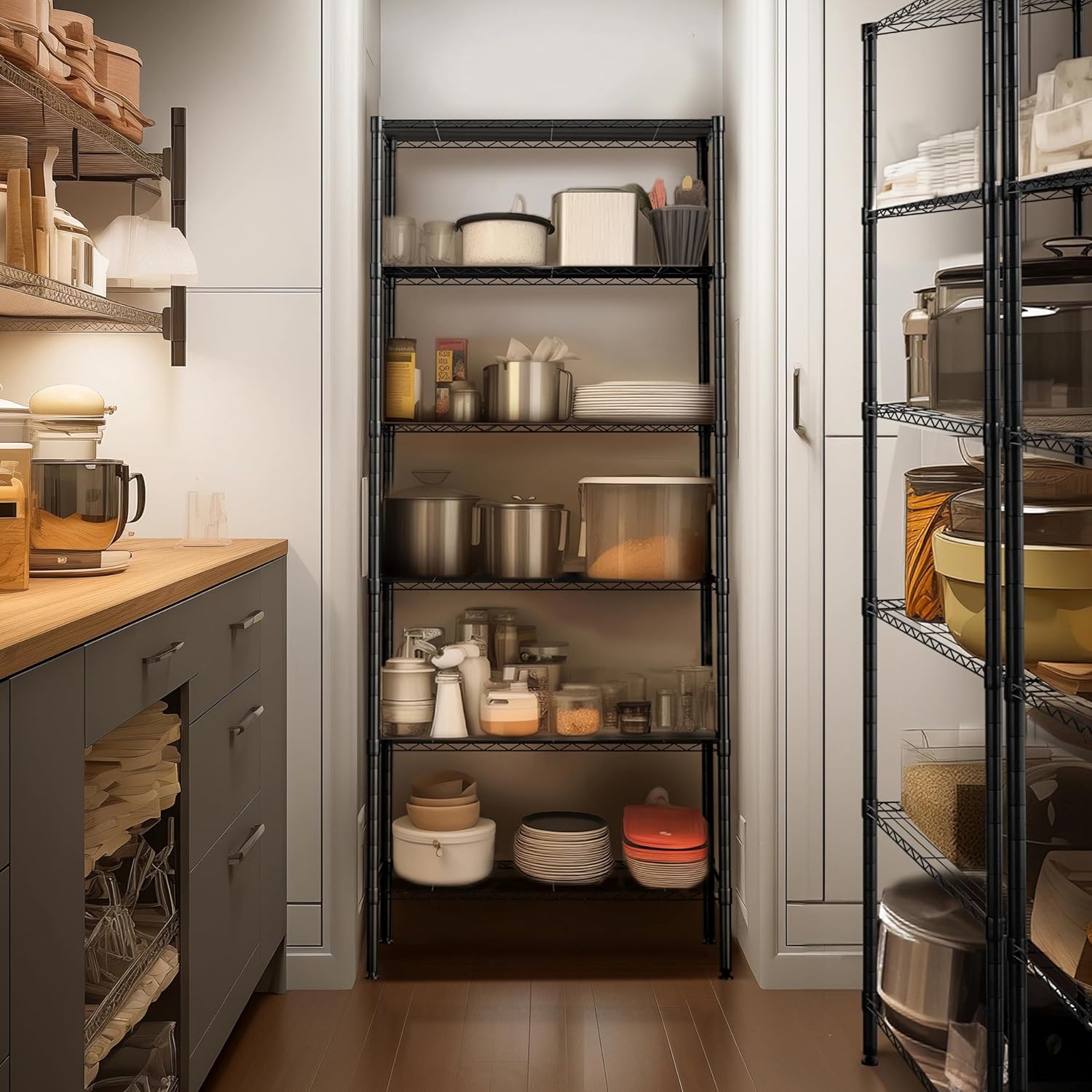 - RELIABLE & STURDY CONSTRUCTION - NSF Certified to ensure the quality. 250 lbs loading capacity per shelf with leving feet (evenly distributed) totally 1500 lbs, perfect for home use. Wire shelves adjustable in 1-inches to meet your different storage needs.