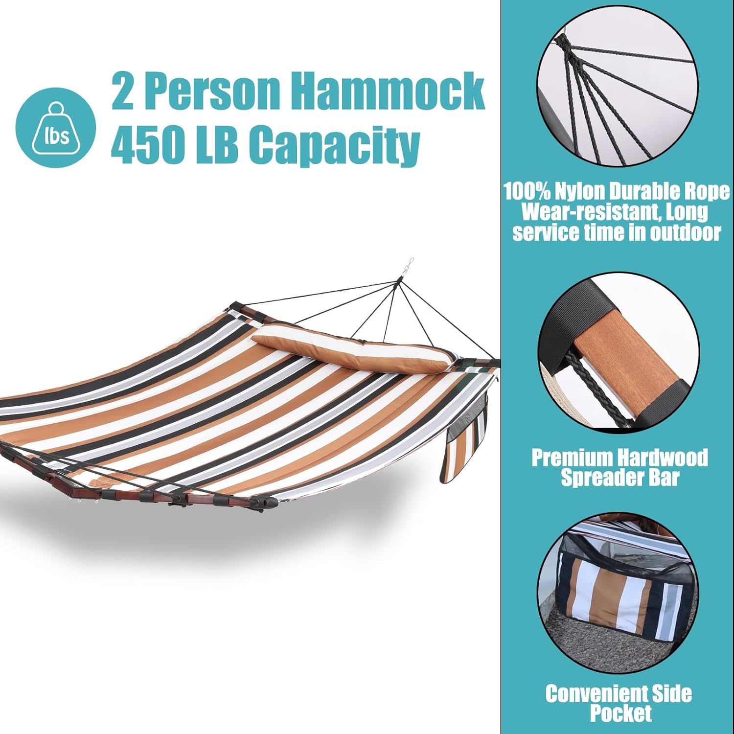 - ★Super Large Hammock: 55in width x 79in length large hammock bed can easily accommodate 2 people to enjoy the leisure time simultaneously (maximum 450lb capacity). The pillow is lengthened to 35.4in for two people. Besides, the hammock comes with a detachable side pocket for phone, books, cups and other stuffs for your convenience.
