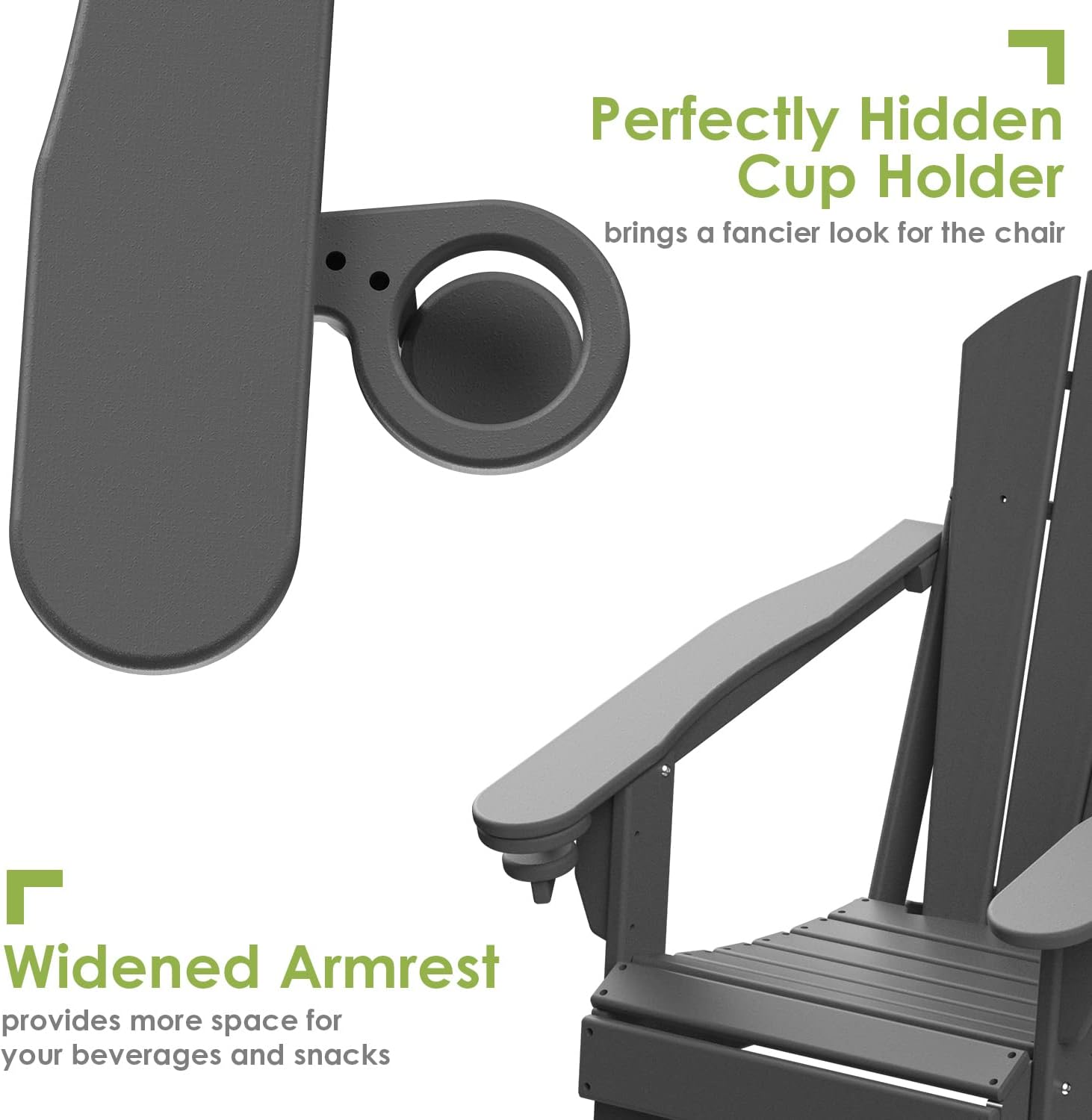 - 【Ergonomic & Foldable】 GreenVines Folding Adirondack chair features a hidden cup holder in the right arm, offering ample space for drinks or media devices. The reclined legs are designed for stability without the need for pins or chains. Easily foldable, this chair is perfect for storage at home or for taking on road trips. The slatted seating ensures quick drying after rain, while trimmed edges enhance safety for you and your family