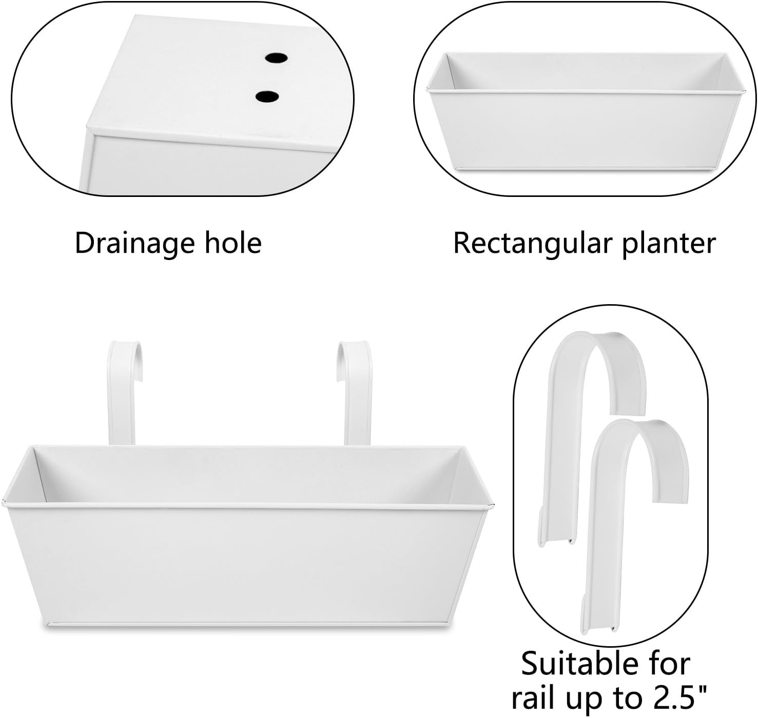 - PERFECT SIZE: Our railing planters measure 16" x 5.1" x 5.1", and the hook is suitable for railings up to 2.5 inches. Make sure to check the size before purchasing, and note that the hook arrives disassembled.