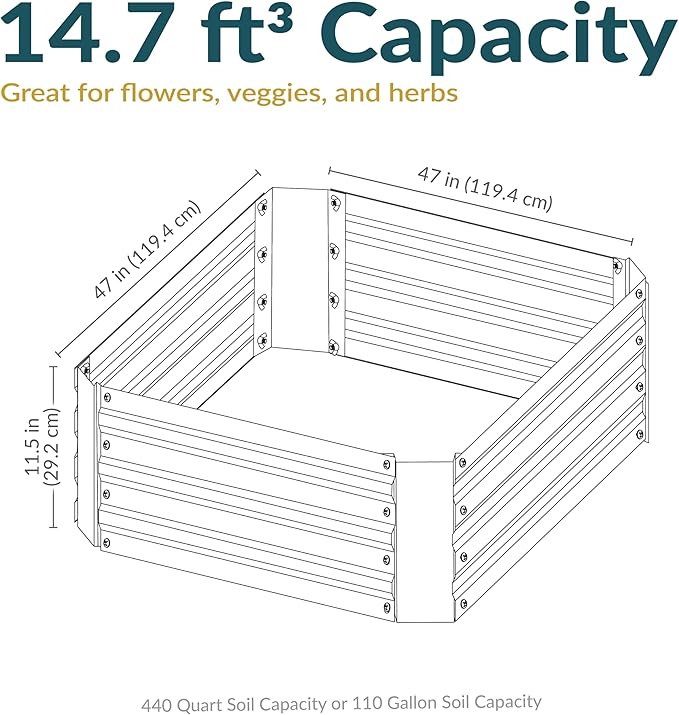 - AMPLE SPACE FOR HEALTHY GROWTH: This galvanized metal garden bed provides plenty of room for growing a variety of deep-rooting plants in the backyard. The raised planter box measures 47" W x 47" D x 11.5" H, weighs 12.8 lbs, and has a soil capacity of 110 gal (14.7 cu ft).