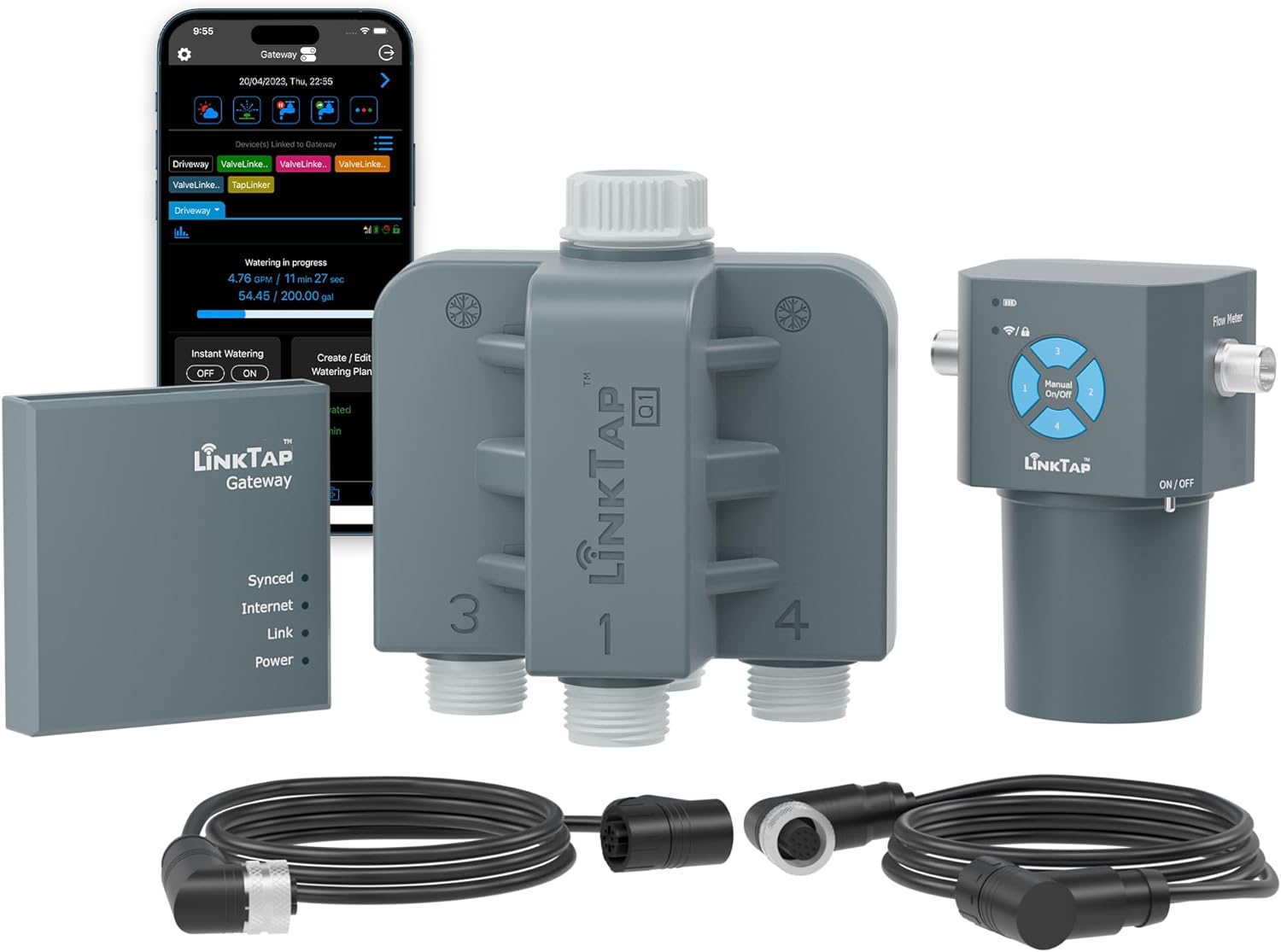 LinkTap Q1 4-Zone Wireless Water Timer & Gateway, 4 Separate Ports, 4 Built-in Flow Meters, Equals Four G2S Smart Hose Timers, Easy Install & Use, 2-Year Warranty