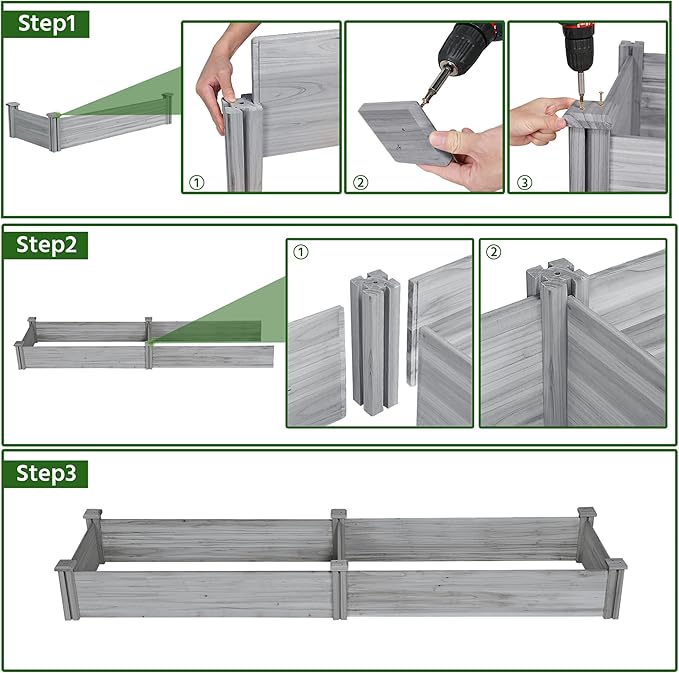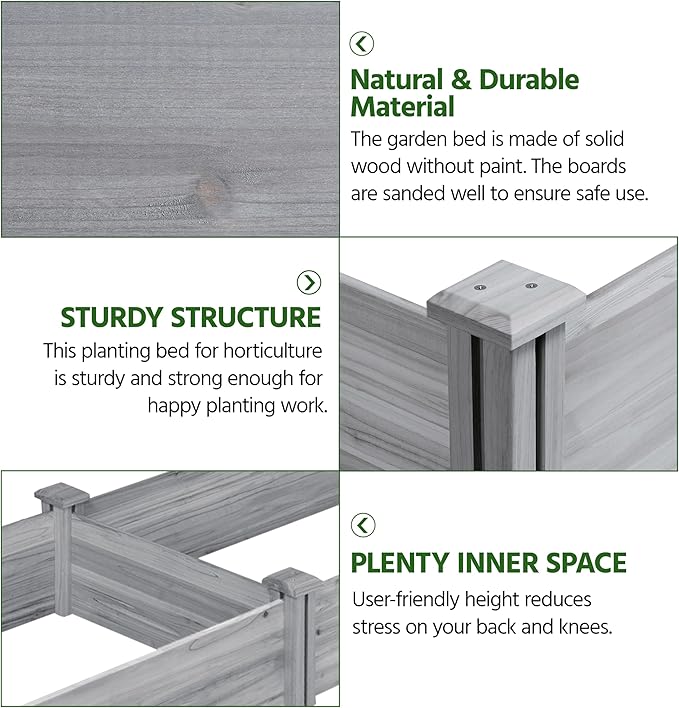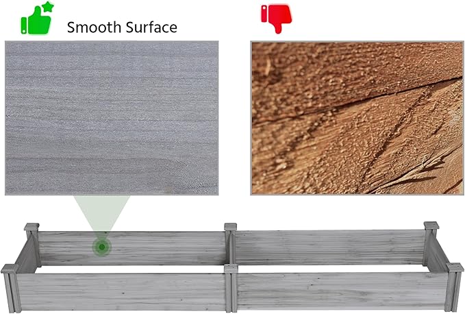 - SINGLE-PIECE SIDE PLATE -- Comparing to other planting beds that have several small pieces of wooden plates at the side, our planting raised bed has a piece of complete side plate at each side of the garden bed. It is fixed firmly without leakage of soil. The whole structure is simple but stable for easy usage