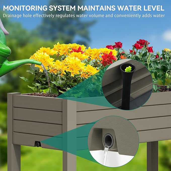 - Effortless Water Management: Our elevated garden bed features a central divider for effective soil separation and a float system for precise water level monitoring; Side drainage holes ensure optimal moisture control