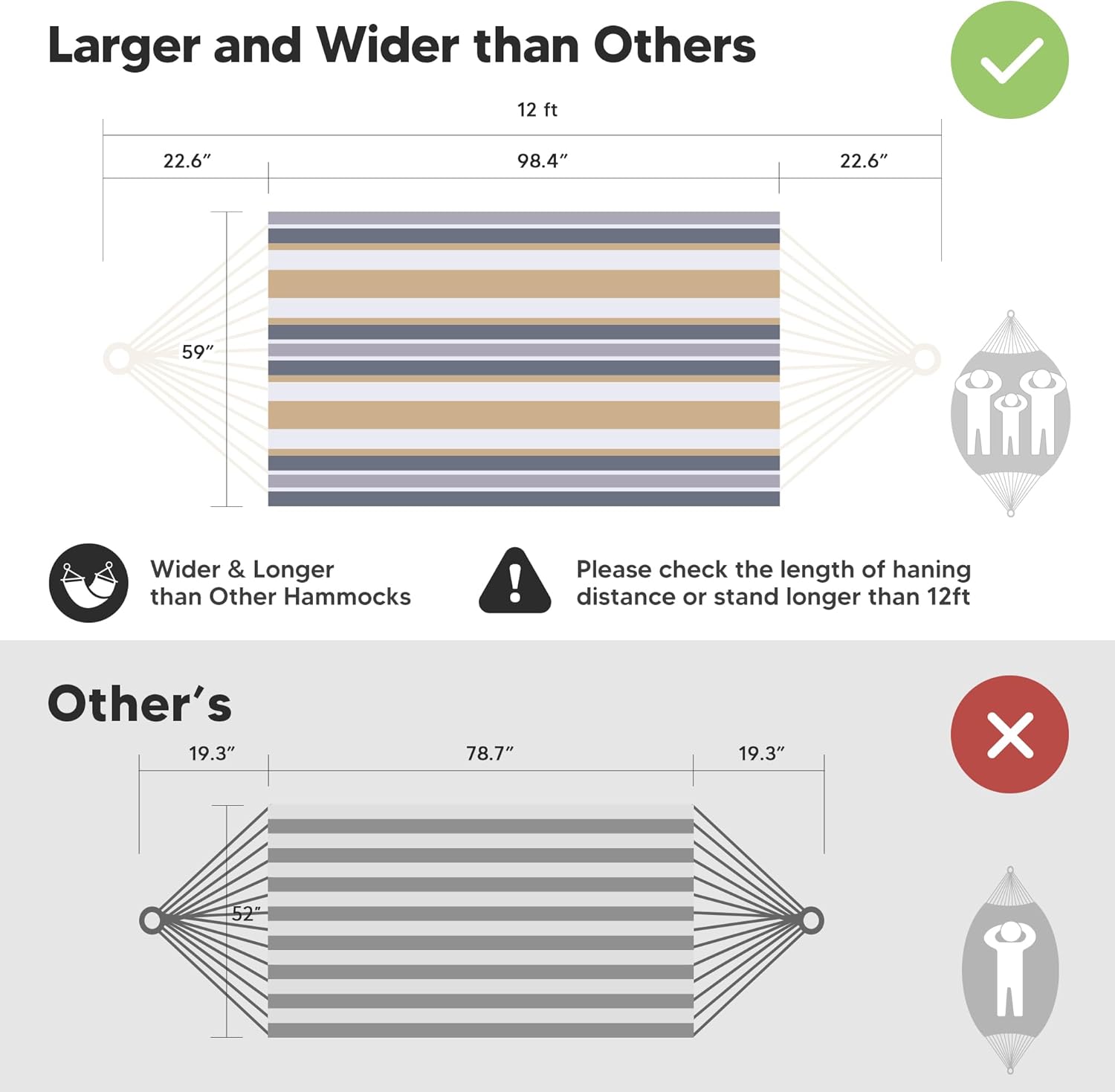 - Larger Bearing Capacity: The heavy duty hammock's total length (from loop to loop) is 144 Inches while the bed size is 98”long X 59”wide, making it perfect for couples