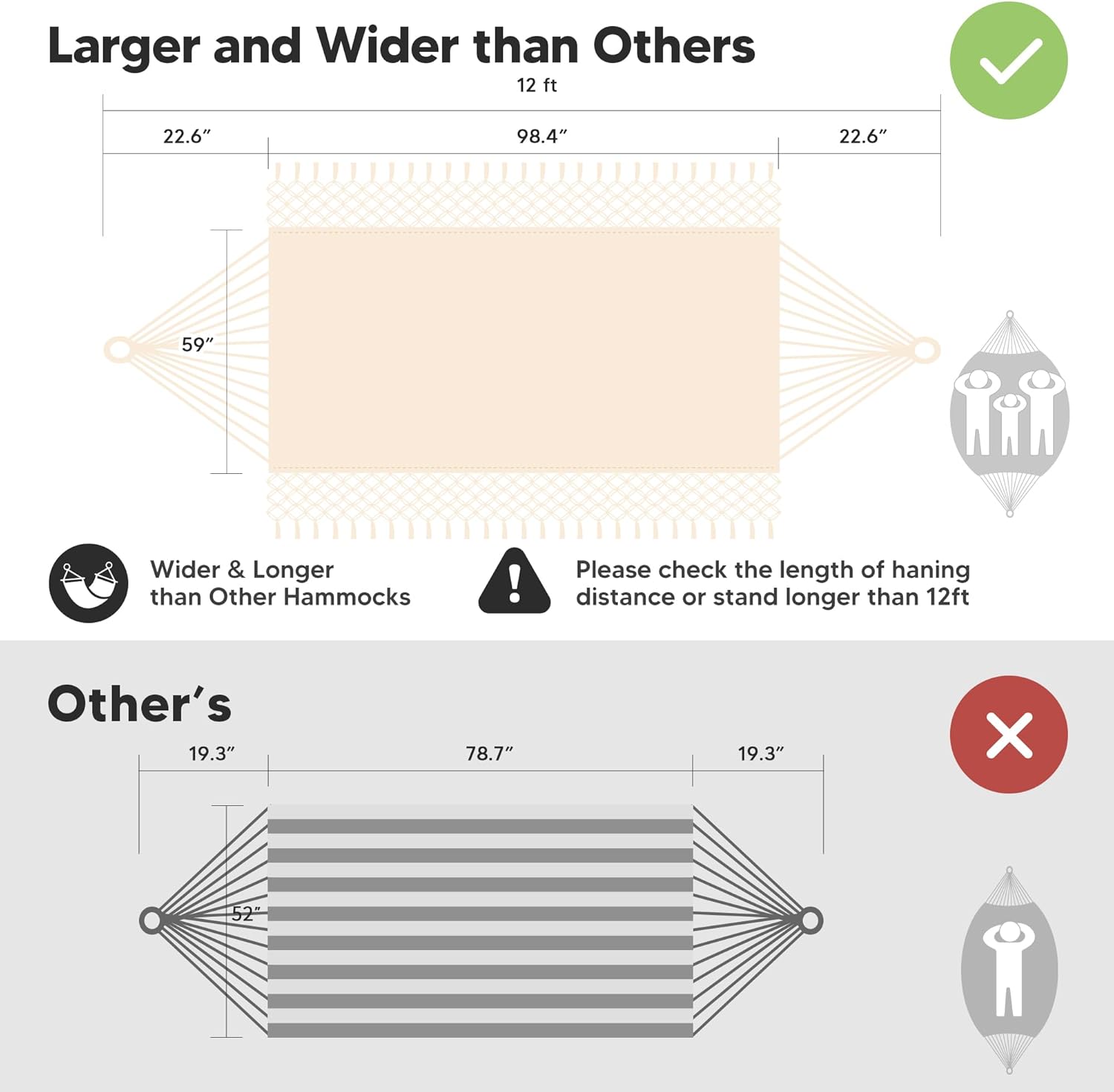 - Larger Bearing Capacity: The heavy duty hammock's total length (from loop to loop) is 144 Inches while the bed size is 98”long X 59”wide, making it perfect for couples
