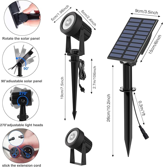 - Larger & Flexible Solar Panel: The larger solar panels provide higher photoelectric conversion rate up to 20%. You can rotate 90° up and down to capture sun energy effectively. Light head is 270°rotatable to illuminate any place that would be out of reach