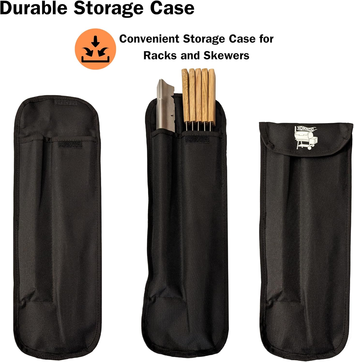 - Convenient and Portable Storage - Premium durable Oxford Cloth Storage Case holds the two racks and five skewers with a hook and loop closure. The racks and skewers are kept in two separate pockets to keep your kit organized and protected.