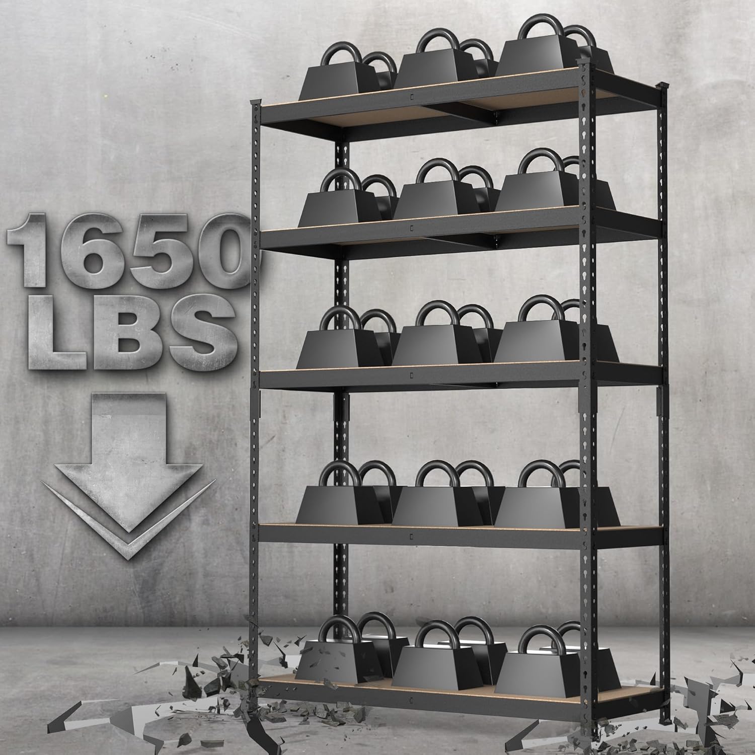 - 【1650 lbs Load Capacity】Made of high-quality metal frame and MDF Board, this shelving unit is more steady and tough than normal garage shelves. The maximum capacity is up to 1650 lbs total, 330 lbs per shelf, which can store much more stuff and tools in your garage or warehouse.