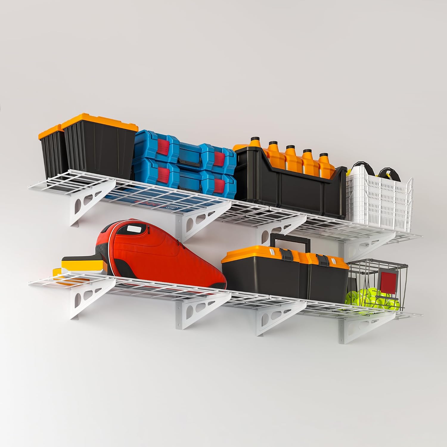 - High Load Capacity: The shelving can safely hold a total load of 600 pounds. Manufactured from high-quality materials, this garage storage rack has a sturdy and durable structure that can safely store a variety of items such as tools, utensils, boxes and more.