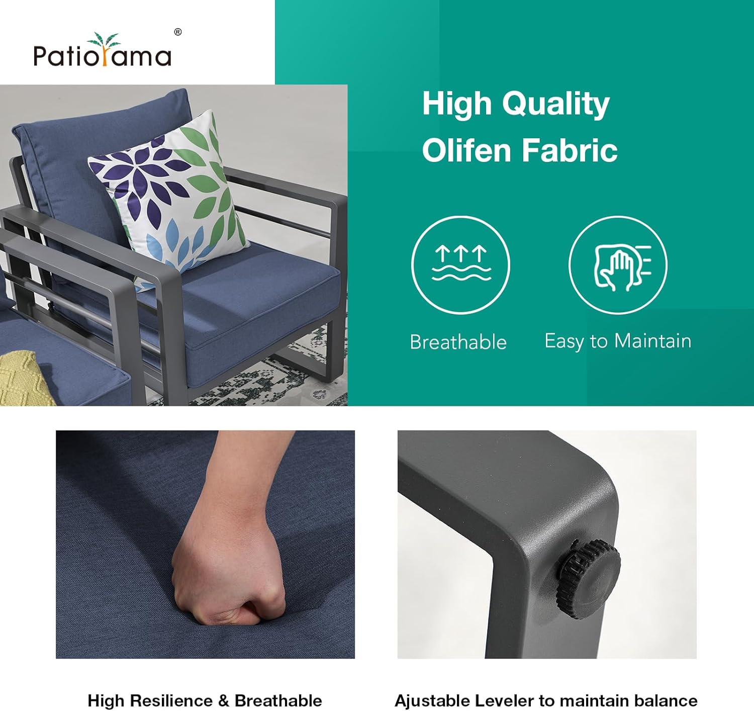 - [Personalize Your Outdoor Space]: Scaled just right, the Patiorama 4-Piece patio aluminum furniture sets a casual, slightly retro modern vibe tone that offers outdoor comfort and relaxation. Shipped in 3 boxes, the sectional sofa set includes: armchair x 2, 3-seater sofa x 1, coffee table x 1. Light assembly is required (tools included). Modular design allows free rearrangement into different shapes to meet your needs for sitting or lying down.