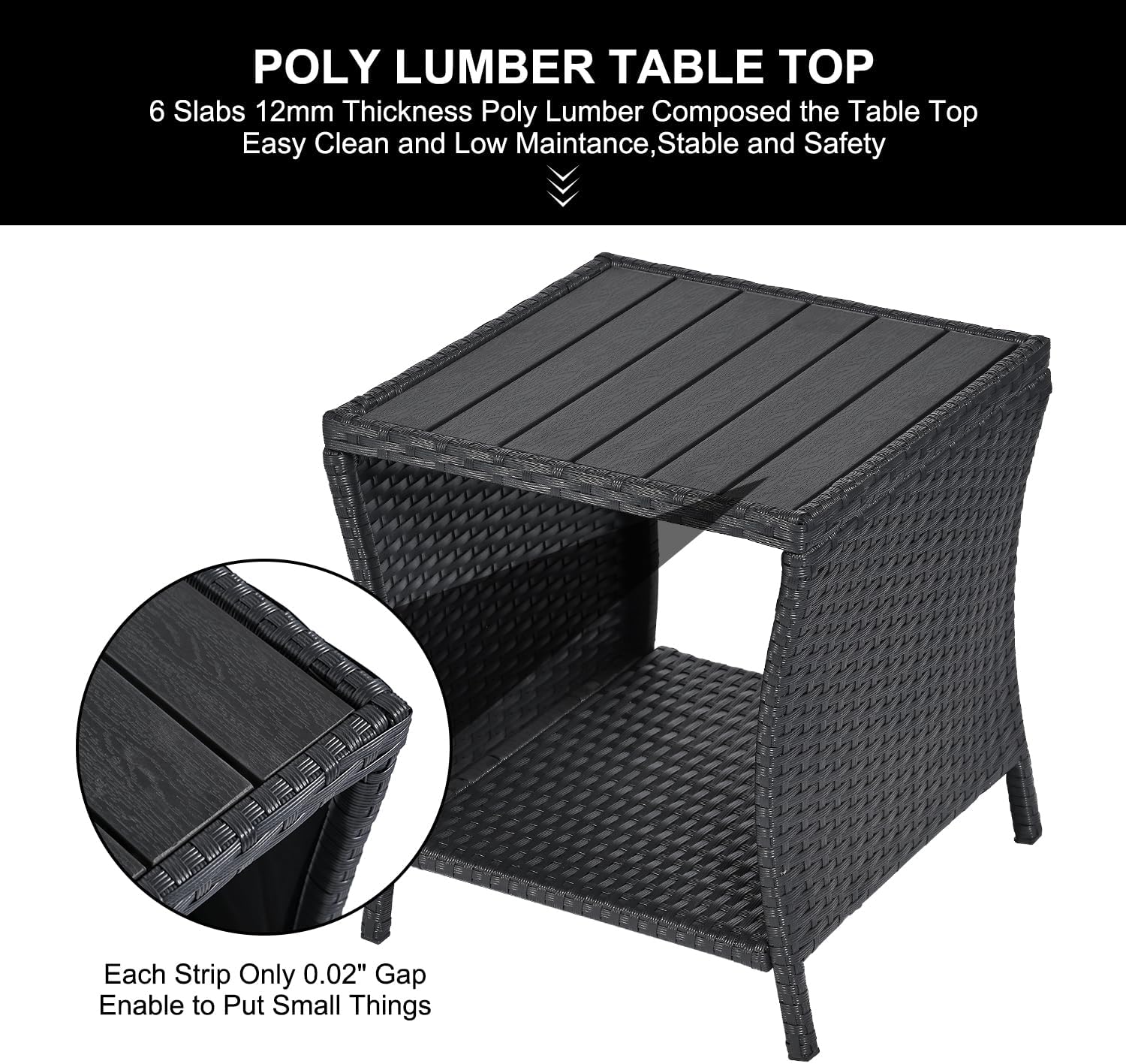 Outdoor Side Table Small Outdoor End Table for Patio Black Wicker Rattan Coffee Table with Storage & Poly Lumber Table Top Square for Outside Balcony Porch Backyard Deck