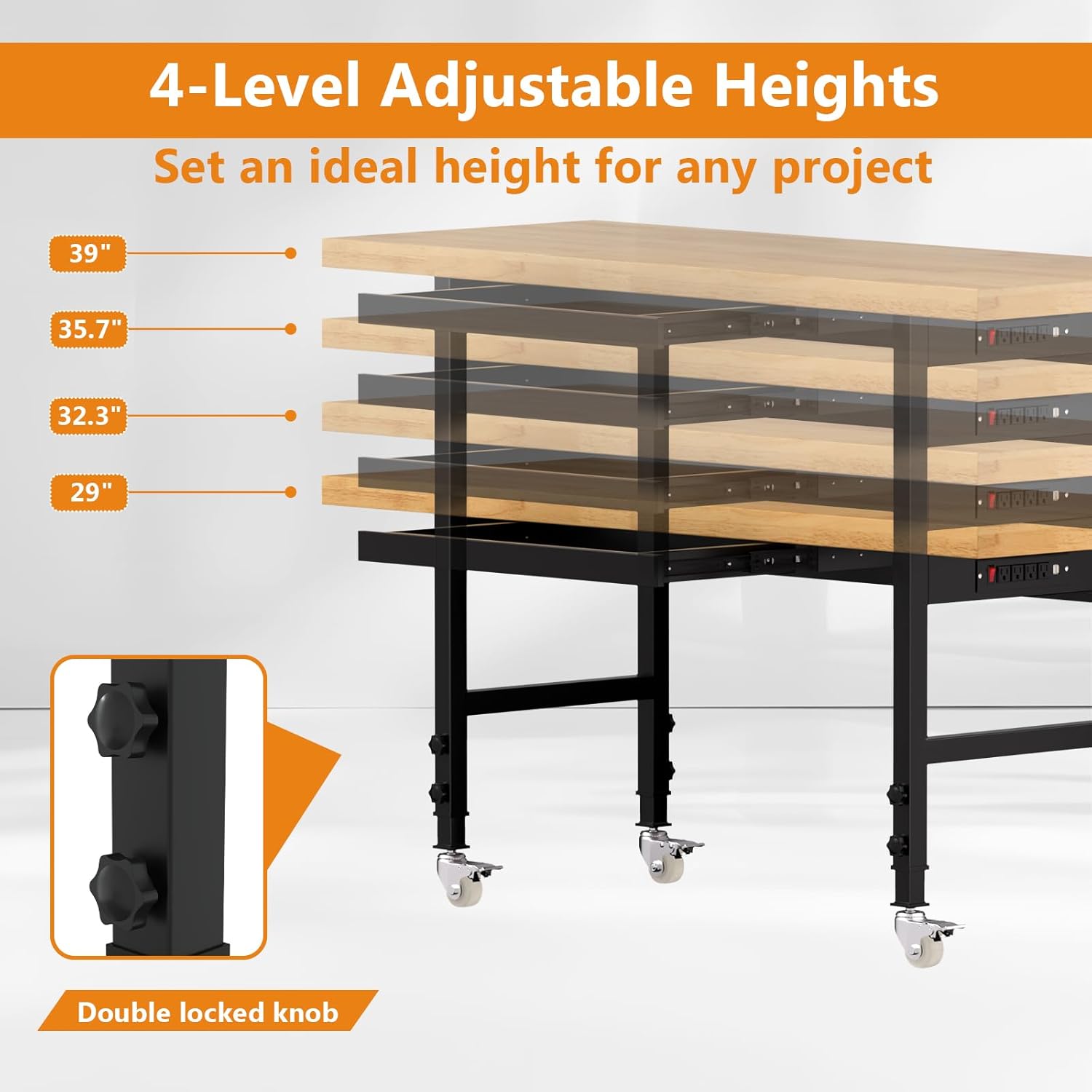 Solid Wood 60" Work Bench with Wheels, Heavy-Duty Workbench with Drawers, Adjustable Height Work Table with Power Outlets, 2000 LBS Capacity Workstation for Garage, Workshop(60" X 24")