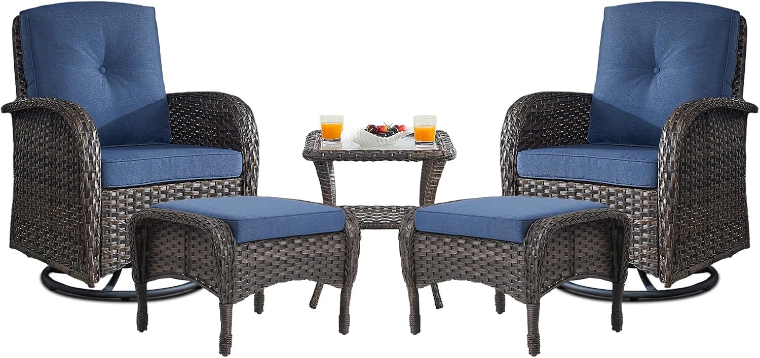 Small Conversation Sets Patio Funiture - 5 Piece Outdoor Swivel Rocker Wicker Furniture Sets with Ottomans Side Table Perfect for Patio Deck Backyard, Brown Wicker Blue Cushion