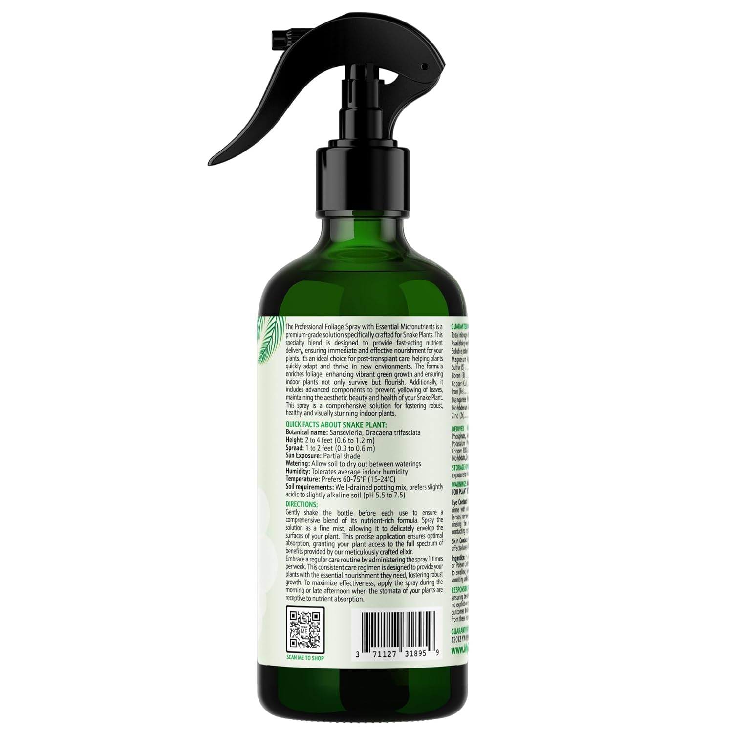 Professional Foliar Plant Spray with Essential Micronutrients 3-1-2 for Snake Plants, Dracaena trifasciata, Sansevieria - Liquid Fertilizer - Plant Food - Plant Shine - Plant Care (16 OZ)