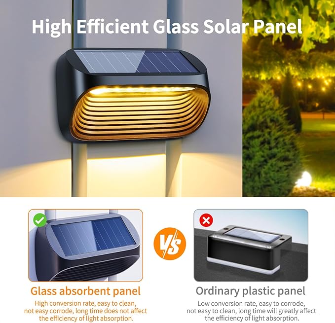 - 【Upgraded Tempered Glass Solar Panel】 Our fence solar lights adopt the cadmium telluride solar panel, which has a high light absorption rate and a conversion efficiency up to 30%. The solar fence lights can also be charged on cloudy days. With this excellent performance, our solar deck lights outdoor waterproof can stay lit for 10-12 hours at night after charging in the sun. Plus, solar panels of the deck lights solar powered are easy to clean, won't corrode, and don't affect the light absorption efficiency over time. Give your outdoor landscape a lasting and gorgeous lighting effect